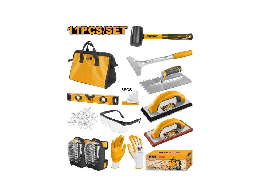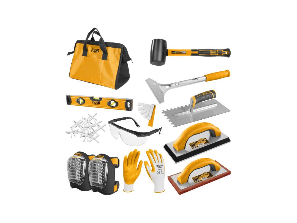 Egy teljes csempe fektető eszközkészlet és a hozzá tartozó munkavédelmi felszerelések