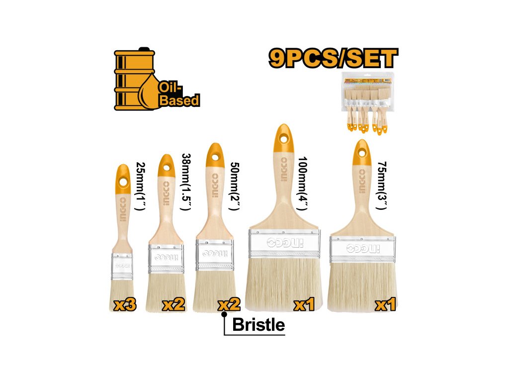 Pre olejové farby Rozmery: 3 ks 25 mm (1), 2 ks 38 mm (1,5), 2 ks 50 mm (2), 1 ks 75 mm (3), 1 ks 100 mm (4 )Drevená rukoväť Rozsah dodávky: 9 kief, v blistri