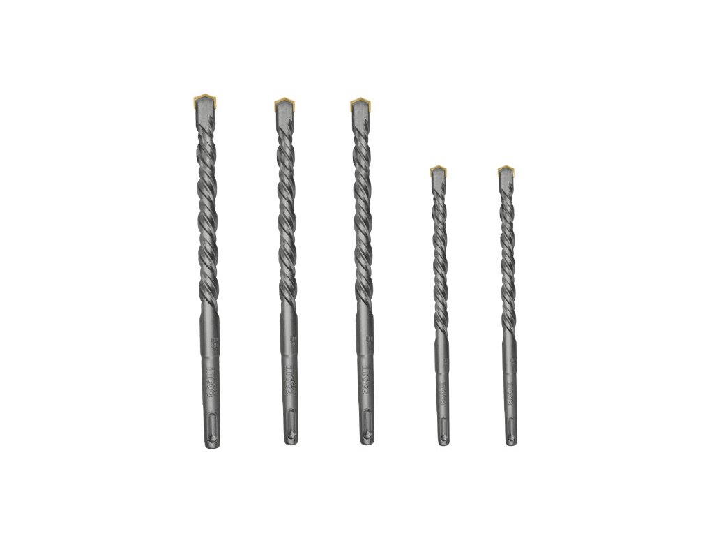 Rozmery: 6 x 110 mm, 8 x 110 mm, 8 x 160 mm, 10 x 160 mm, 12 x 160 mm Rozsah dodávky: 5 ks SDS-Plus skalný vrták, Plastový držiak