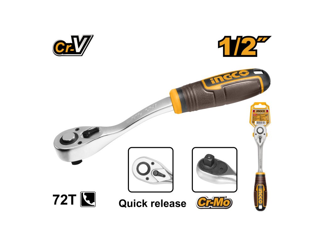 2. A racsnis fej kiváló minőségű króm-molibdén acélból kovácsolt, erős nyomatékkal és belső ív hajtási szög tervezéssel. Jó záróerővel rendelkezik, nem csúszik könnyen, gyorsan kioldható és munkát takarít meg. A foglalatot csak egy gombnyomással könnyedén leejthetjük. Egy kézzel is működtethető. A bal és jobb irányú átkapcsoló lapátok mindkét irányban állíthatók, hogy javítsák a munkahatékonyságot. A 72 fogas kialakítás csak 5°-os forgatást igényel egyszerre, és könnyedén használható kis helyen is.