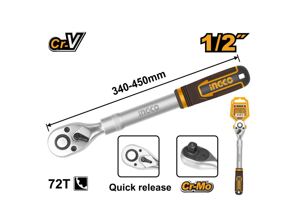 INGCO Račňový hnací hriadeľ 1/2 340-450 mm 72T teleskopický CrV