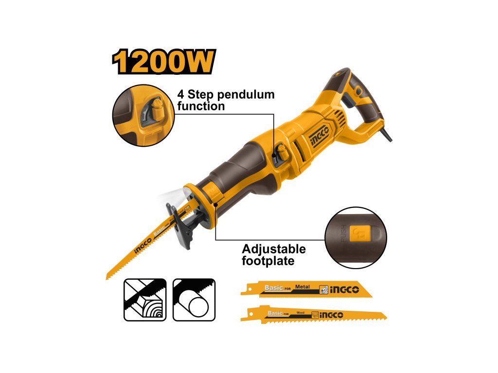 Az INGCO RS12001 nagy teljesítményű, 1200 W-os elektromos szablyafűrész, amelyet úgy terveztek, hogy különféle anyagok (mint fa, fém és alumínium) vágására is alkalmas legyen.