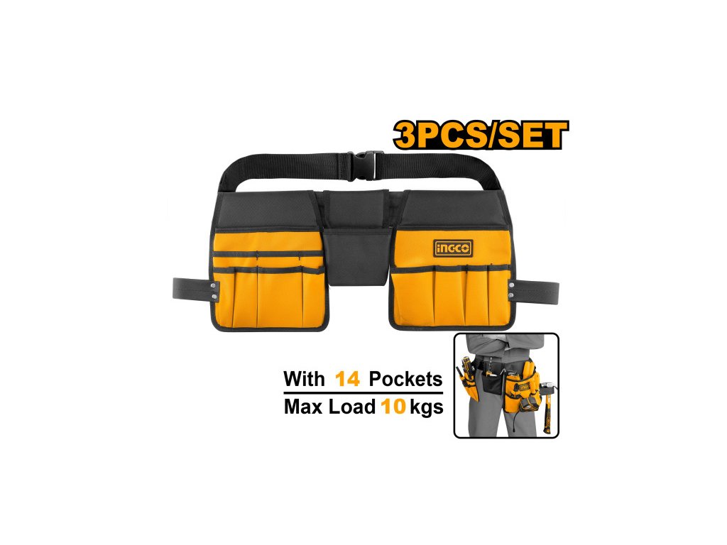Materiál: 600D polyester Maximálna nosnosť: 10 kg Veľkosť vreciek: 2 ks 260 x 230 mm 1 ks 150 x 130 mm Nastaviteľný popruh: 920 - 1270 mm 14 ks vreciek 2 ks držiak na kladivo Rozsah dodávky: 1 ks puzdro na opasok, papier balenie karty