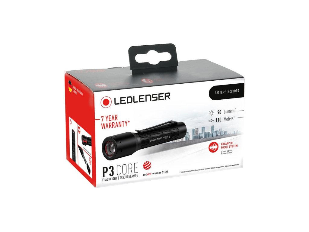 Az ultrakompakt Ledlenser P3 Core mini zseblámpa meglep az erős teljesítményével és azzal, hogy elfér egy nadrág- vagy ingzsebbe. A Ledlenser által szabadalmaztatott Advanced Focus Systemnek köszönhetően folyamatosan fókuszálható a fénye. További jellemzői a funkcionális klip és a könnyen kezelhető végzáró kapcsoló. A P3 Core üzemeltethető AAA alkáli elemmel (tartozék) vagy NiMH újratölthető akkumulátorral.