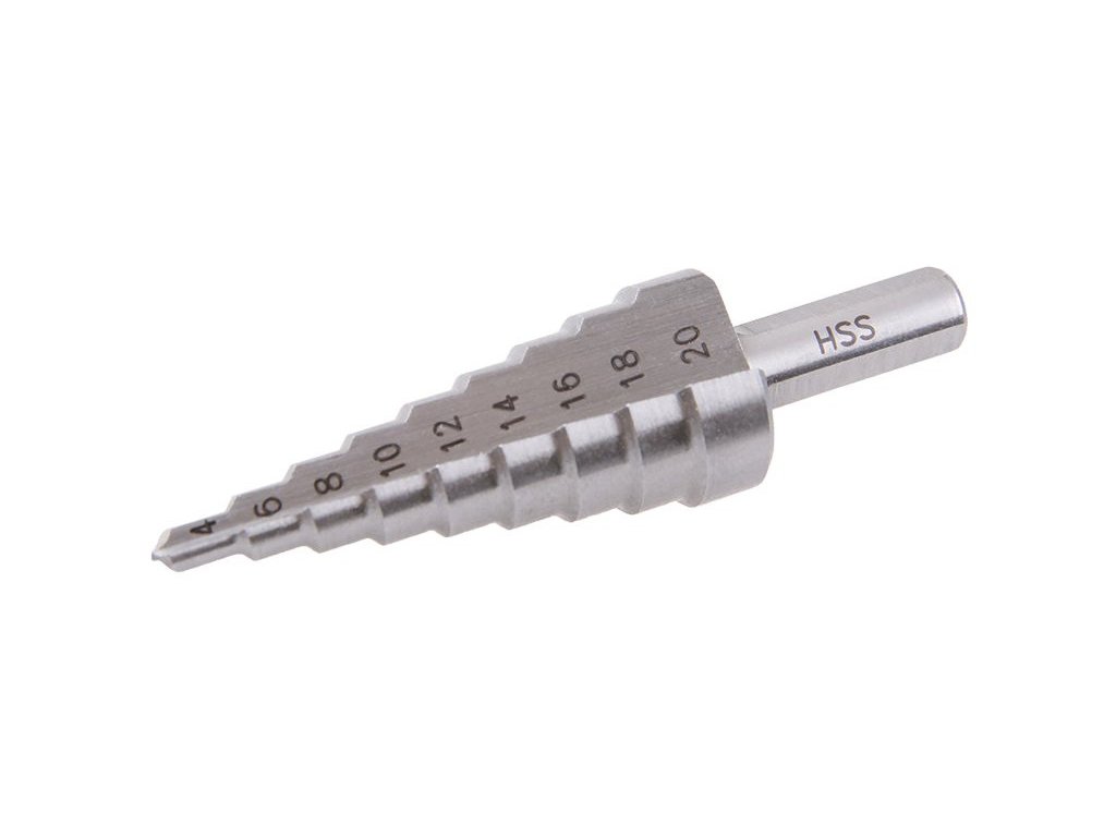 step drill made of quality HSS steel DIN 1412C for drilling alloys and steel sheets up to 4 mm thick, plastic and wood, wide grooves easily remove the drilled material 9 degrees, 4, 6, 8, 10, 12, 14, 16, 18, 20mm