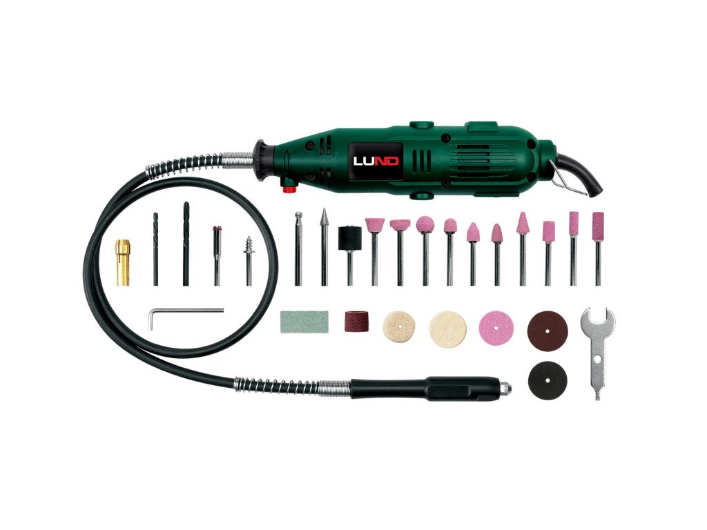 Többfunkciós szerszámkészlet, amely lehetővé teszi többek között a fúrást, csiszolást, polírozást, marást, gravírozást. A többfunkciós csiszoló rugalmas csatlakozással rendelkezik, ami különösen hasznos a nehezen hozzáférhető helyeken végzett munkához.
