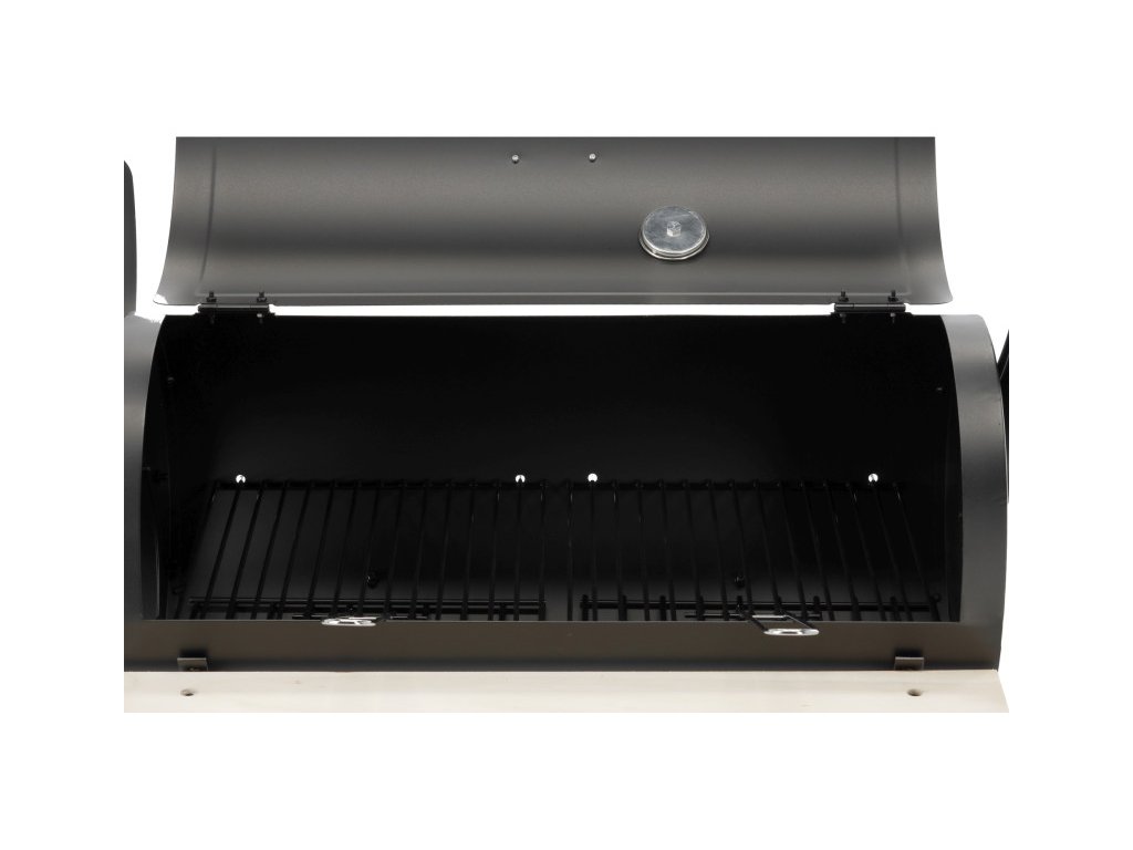 - magas és széles kémény szabályozható kimeneti nyílással, ami a lezárt fedél mellett elvezeti a füstöt grillezés közben.