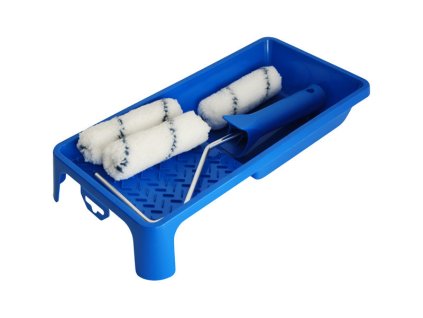 Obsah setu: 1 zásobník na farbu – 150 x 290 mm 1 ks Rukoväť – 100 mm 3 valce Blaufaden – 100 mm 25 mm modrá maliarska páska