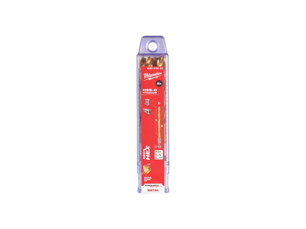 MILWAUKEE Špirálový vrták 8,0 x 111/70 mm HSS-G TiN, Red HEX - Shockwave™ (5 ks v balení)