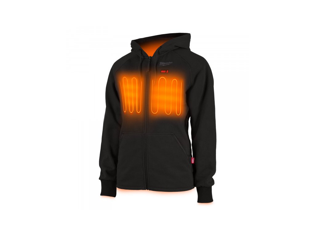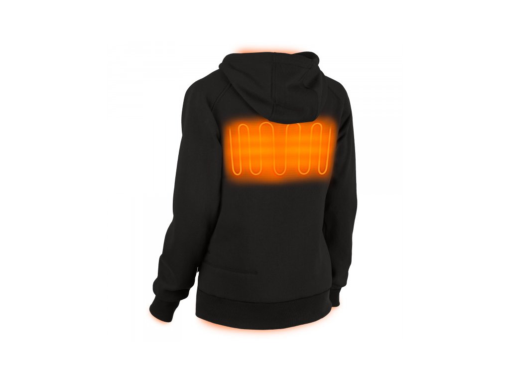- A szénszálas fűtőelemekkel ellátott M12™ fűthető női kapucnis pulóver M12™ akkumulátorral működik, amely hőt hoz létre és vezet el a mellkason és a háton.