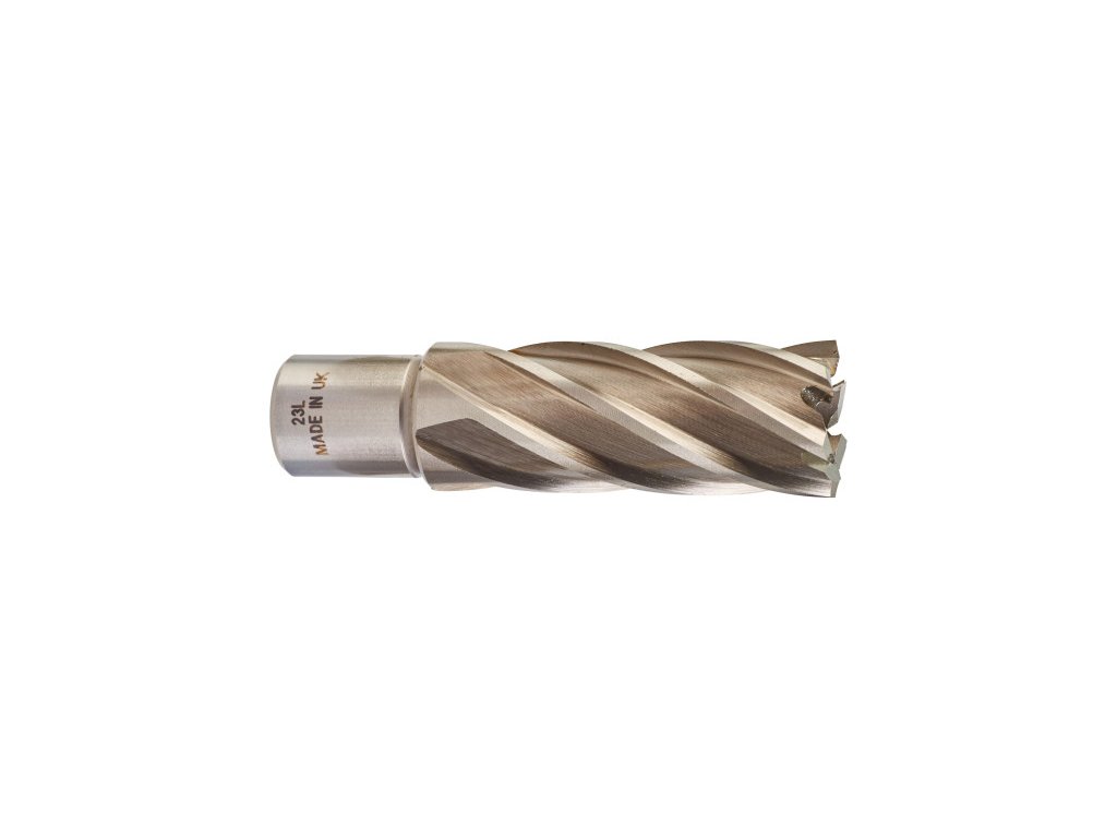 - 100 %-kal gyorsabb - Sebesség- és idő megtakarítást érhetünk el a következő tényezőknek köszönhetően: Először a magfúró az anyagot a lyuk szélén vágja meg a csigafúróval ellentétben, amely a lyukat teljes átmérőjében fúrja. Másodszor a két agresszív kialakítású éles szögenkénti vágóél előnye, hogy gyorsabb előtolást és kisebb vágási ellenállást biztosít.