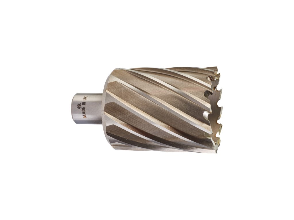 - 100 %-kal gyorsabb - Sebesség- és idő megtakarítást érhetünk el a következő tényezőknek köszönhetően: Először a magfúró az anyagot a lyuk szélén vágja meg a csigafúróval ellentétben, amely a lyukat teljes átmérőjében fúrja. Másodszor a két agresszív kialakítású éles szögenkénti vágóél előnye, hogy gyorsabb előtolást és kisebb vágási ellenállást biztosít.