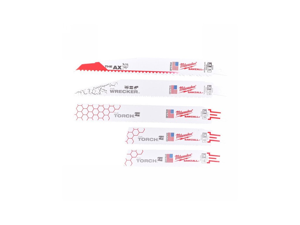 Tartalom | 1 x AX™ szeges fához - 230 mm x 5 TPI (48005026), 1 x WRECKER™ univerzális - 230 mm x 8 TPI (48005706), 1 x TORCH™ fémhez 230 mm x 14 TPI (48005787), 1 x TORCH™ fémhez - 150 mm x 14 TPI (48005782), 1 x TORCH™ fémhez - 150 mm x 18 TPI (48005784) |