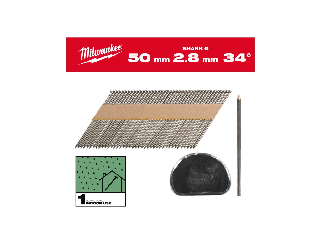MILWAUKEE Stavebné sponky, D-hlava, lesklé, 34° SC1 - 2,8 x 50 mm (2200 ks/bal)