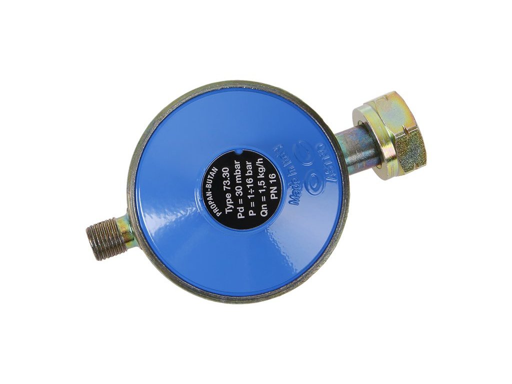 The low-pressure LPG regulator automatically reduces the gas pressure and maintains it at the set level. It is designed for use in a covered area to avoid clogging the air hole. It is equipped with a W 21.8 x 1/14" L union nut for connecting the valve at the inlet and a G "L thread at the outlet. Pd - 30 mBar, On - 1.5 kg/h. Only persons over the age of 18 who are familiar with safety regulations may install the regulator. Intended for pressure regulation in low-pressure cookers (grills, cookers). Not suitable for PB burners.