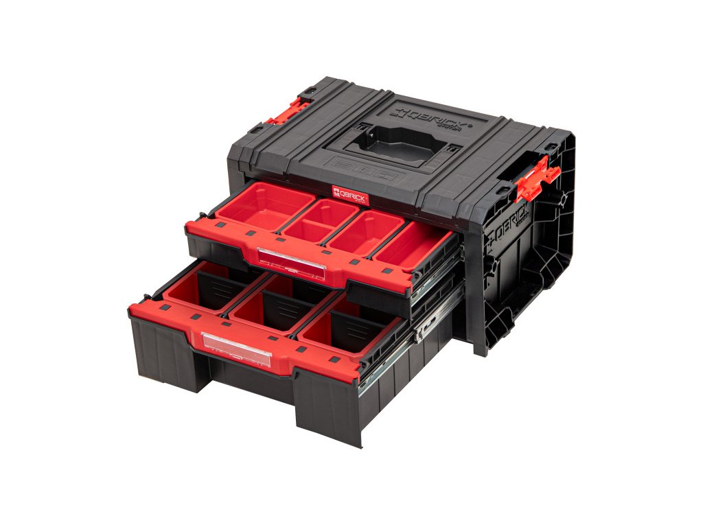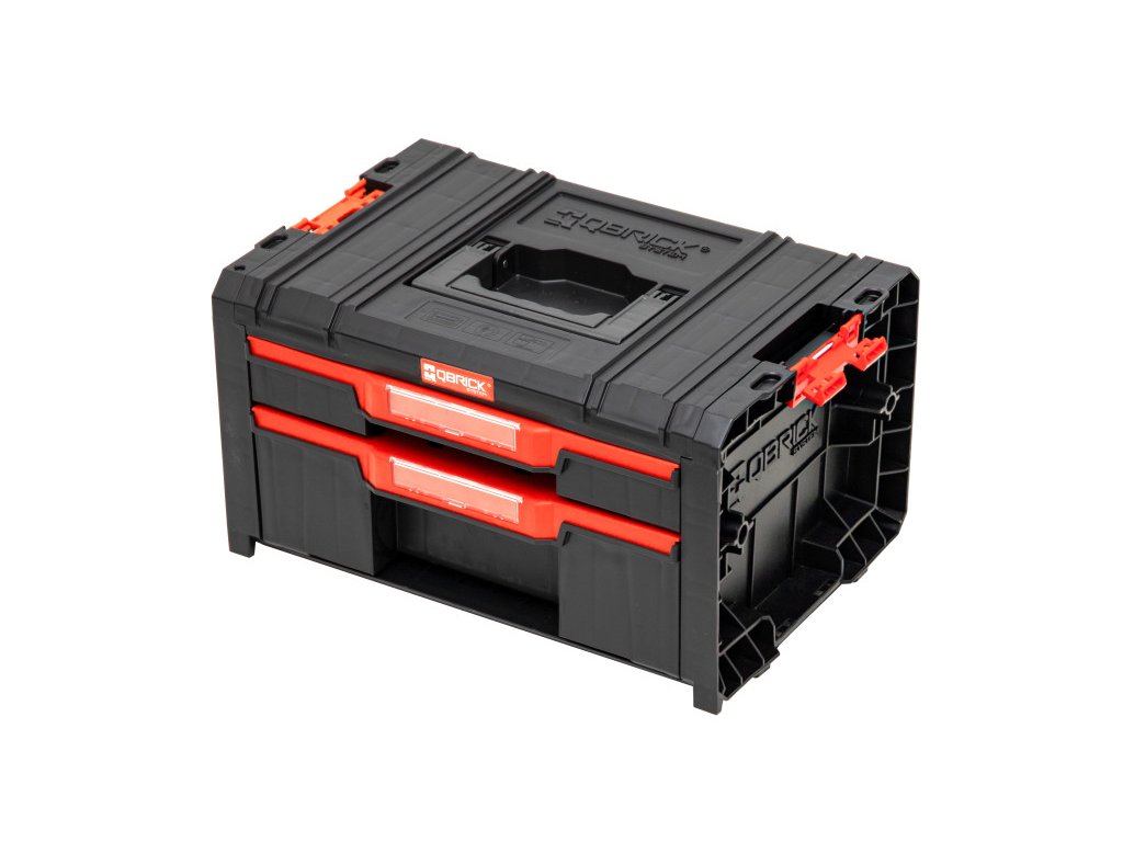 A Qbrick System PRO Drawer 2 Toolbox egy tágas, moduláris eszköztár, amely két kihúzható fiókkal van felszerelve fém síneken.