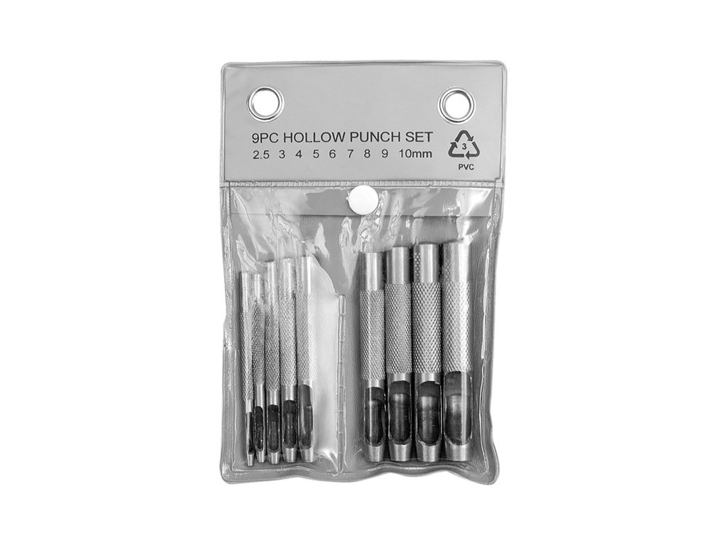 Kompletná 9-dielna sada dierovačov pre presné a rýchle vytváranie okrúhlych otvorov v koži, textíliách alebo kartóne. Ideálna pre obuvnícke, kožiarske a dekoratívne práce.