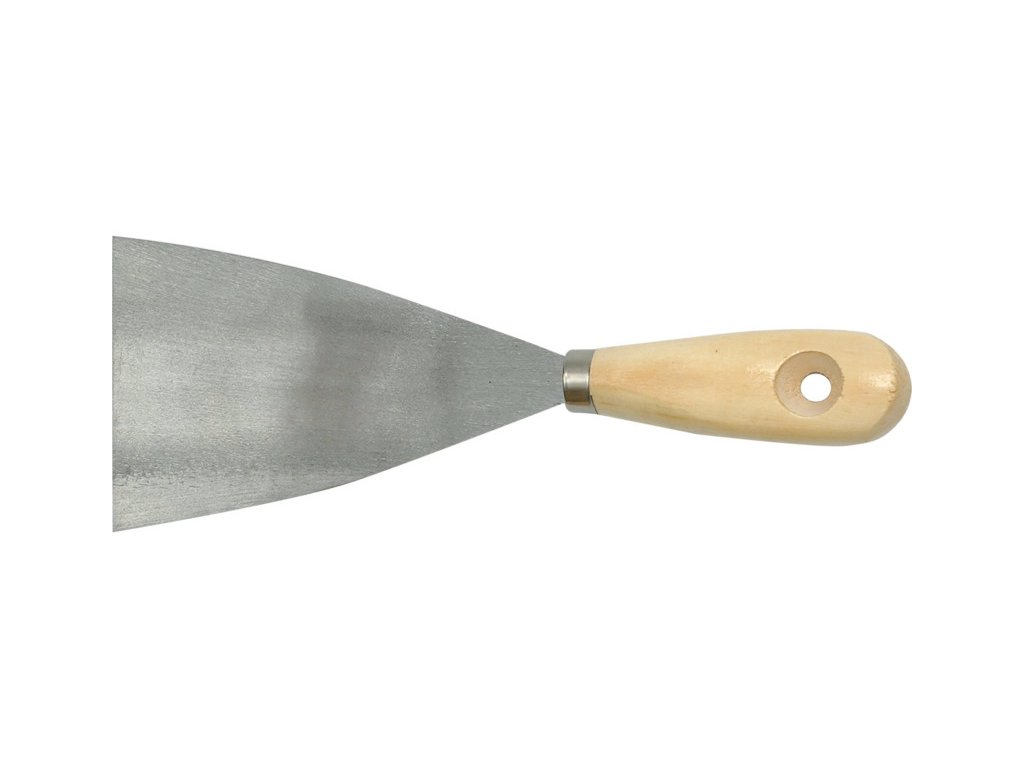 Rugalmas lemezből készült spatula. Klasszikus fa nyéllel, világos lakk réteggel bevont.