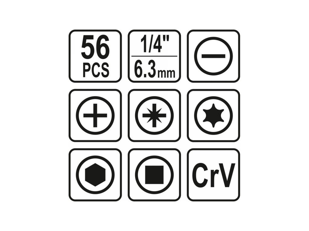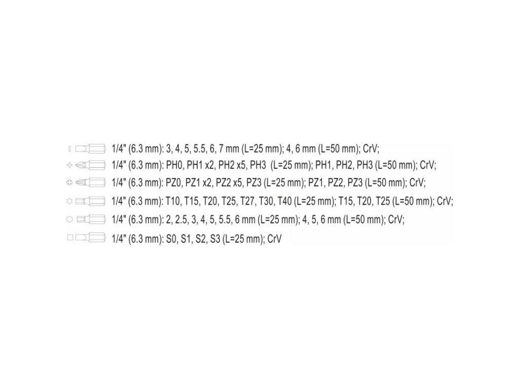 Tervezve nehezen hozzáférhető helyeken lévő csavarok meghúzására és kioldására. Ajánlott autószervizeknek és autórajongóknak. A készlet CRV acélból készült, funkcionális fejeket tartalmaz.