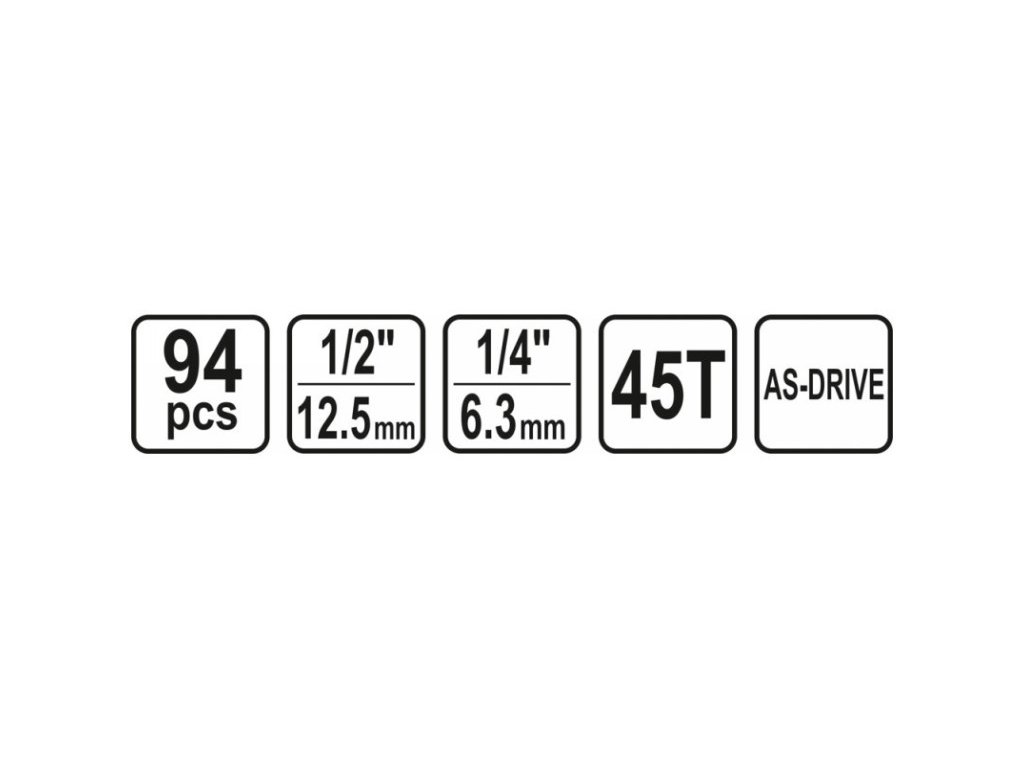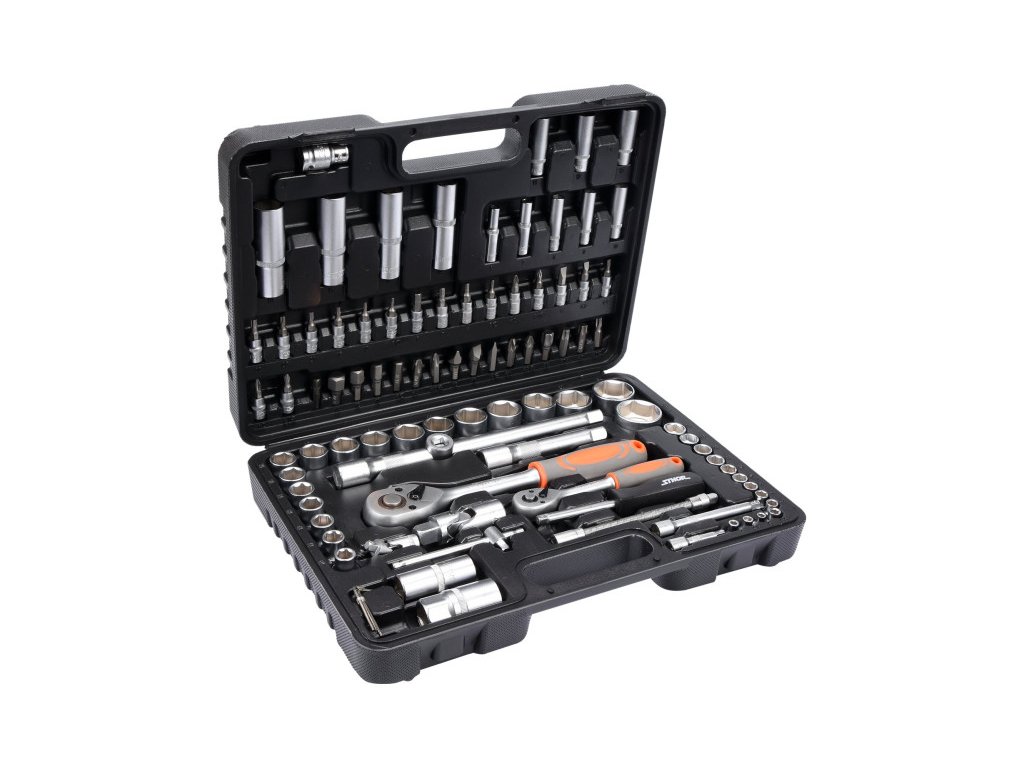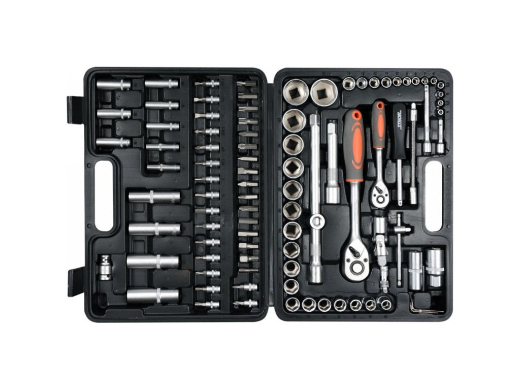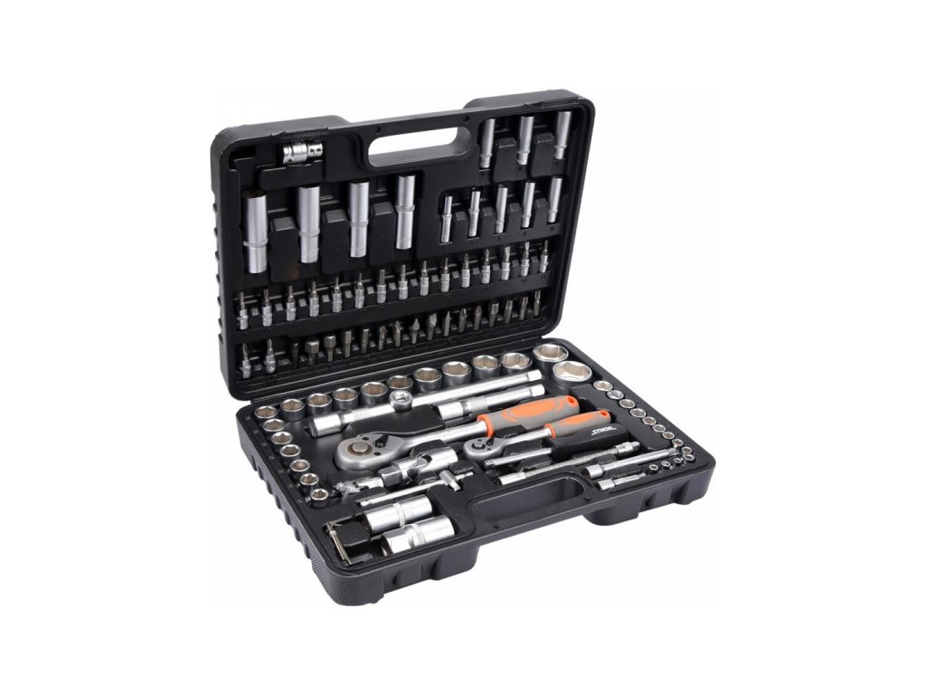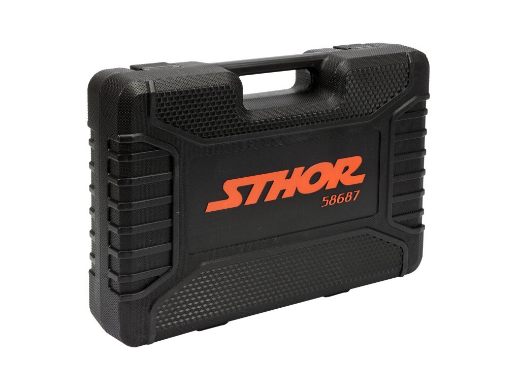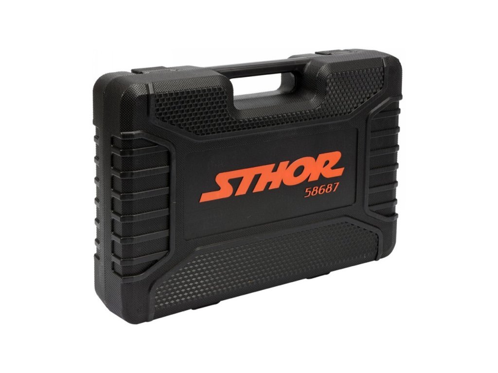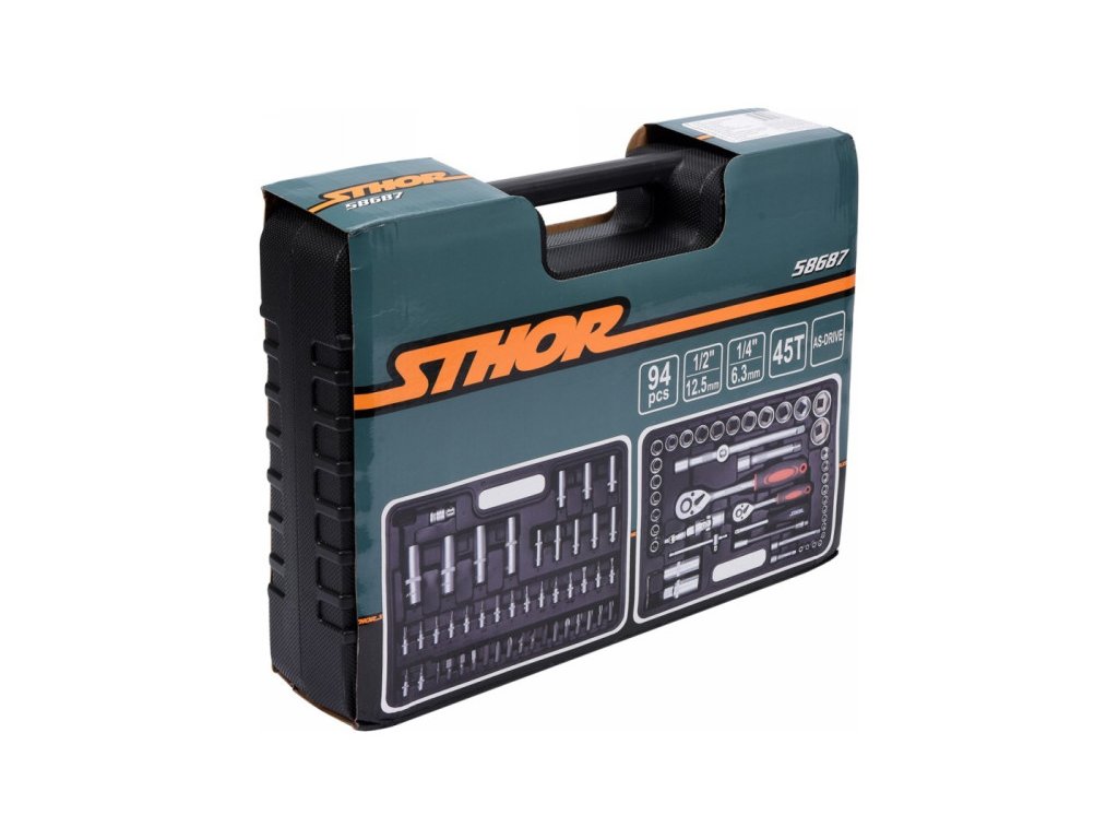 A STHOR eszközkészlet 94 elemet tartalmaz, amelyek egy kényelmes műanyag bőröndben helyezkednek el. Az eszközök precízen készültek megbízható anyagokból. A készlet tartalmazza a hosszú és rövid kupakok teljes választékát 1/4 "és 1/2", toldó, cardan csukló és sok más elemet, beleértve a 45 fogú zártszelvényeket. Ez a konfiguráció azt jelenti, hogy a készletet kisebb szerelési munkáknál, mechanikai javításoknál és sok más háztartási vagy műhelymunkánál használják. A készlet a igényes barkácsolóknak szól. - kupakok 1/2 ": 10; 11; 12; 13; 15; 16; 17; 18; 19; 20; 21; 22; 23; 24; 30; 30; 32 mm - hosszú kupakok 1/2 ": 14; 15; 17; 19 mm, - kupakok 1/4 ": 4; 4.5; 5; 5.5; 6; 7; 8; 9; 10; 11; 12; 13; 14 mm, - 1/4 "tartozékok: 6; 7; 8; 9; 10; 11; 12; 13 mm, - csúszkás gomb 1/4 ", - csavarhúzó 1/4", - toldók 1/2 "x 2 - toldók 1/4" x x 2 - 1/4 "rugalmás toldó - 1/2" gyertyák: 16; 21 mm - Cardan csuklók: 1/2 "; 1/4" - Csökkentés: F3/8 "x M1/2" - bit adapter 1/4 " - bit adapter 5/16" 1/2 "kupakkal - 5/16 "bitek: TORX: T40; T45; T50; T55 - Philips csillagfejű: PH3; PH4 - Pozidriv csillagfejű: PZ3; PZ4 - lapos: 8; 10; 12 mm - hatszögletű: 8; 10; 12; 14 mm - Torx csavarhúzó 1/4 "tartozékkal: T8; T10; T15; T20; T25; T30 - Philips csavarhúzó 1/4"-en: PH1; PH2 - Pozidriv csillagfejű 1/4 "-es tartozékon: PZ1; PZ2 - lapos csavarhúzók 1/4 "tartozékkal: 4; 5.5; 7 mm - hatszögletű csavarhúzó 1/4 "tartozékkal: 3; 4; 5; 6 mm - Imbuszkulcsok: 1.5; 2; 2.5 mm - bőrönd