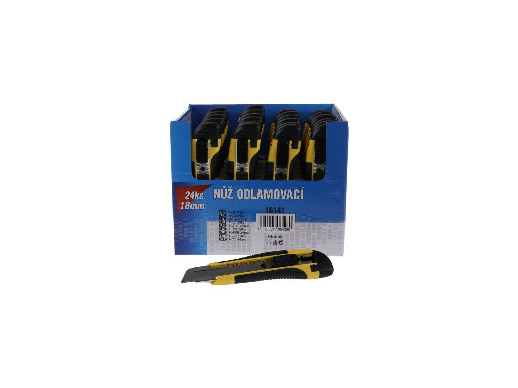 This is a set of 18 mm break-off knives. Sales box 24 pcs. These are quality break-off knives for 18 mm break-off blades. Ergonomically shaped handle. Automatic blade locking with screw safety. Metal bar. Material: metal, plastic.