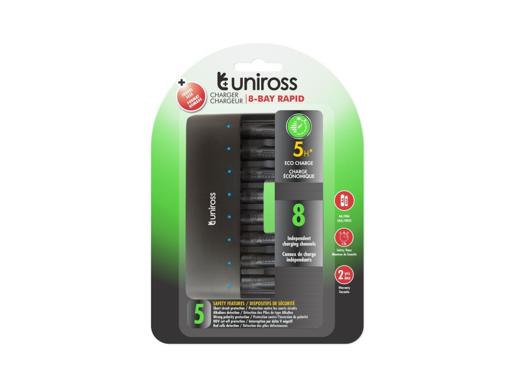 Rýchla nabíjačka procesora UNIROSS s 8-zásuvkovou AA/AAA ochranou