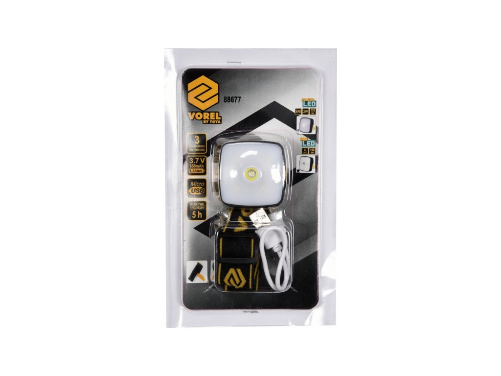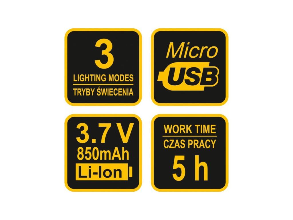 Efektívna čelovka s dvoma typmi svetelných zdrojov, 3 režimami svietenia, odolným ABS puzdrom, flexibilným, nastaviteľným hlavovým mostom, s možnosťou zmeny uhla svietenia Čelovku je možné jednoducho odpojiť od hlavového mosta a nasadiť na háčik alebo zavesiť Ideálna pre stavebné a servisné práce, ako aj pre šport a turistiku Nabíjanie je možné cez micro USB konektor s priloženým USB káblom, ktorý umožňuje nabíjanie pomocou počítač alebo power banka Vstavaná Li-Ion batéria Má kapacitu 850 mAh a v závislosti od spôsobu použitia poskytuje 5 hodín svietenia: zaostrené svetlo generované vysokovýkonnou 3 W diódou uznávanej CREE XPE značka s prúdom 130 lm rozptýlené svetlo generované 4 SMD LED s prúdom 160 lm Technické údaje Napätie (V) 4,5 (3 x AAA) Lumen 130 + 160 Typ batérie LI-ion Kapacita batérie (Ah) 0,8 Výkon (W ) 3 + 2