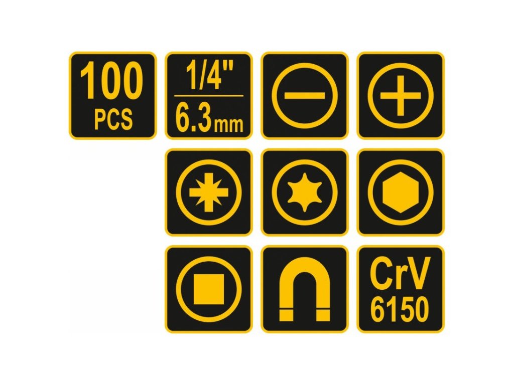 - 60 bit 25 mm: - lapos: 3, 3.5, 4, 4.5, 5, 5.5, 6, 6.5, 7, 8 mm - Phillips: PH0 x 2, PH1 x 2, PH2 x 3, PH3 x 3 - Pozidriv: PZ0 x 2, PZ1 x 2, PZ2 x 3, PZ3 x 3 - TORX: T6, T8, T10, T15, T20, T25, T27, T30, T35, T40 - HEX metrikus: 2, 2.5, 3, 3.5, 4, 4.5, 5, 5.5, 6, 7 mm - HEX hüvelyk: 9/64, 1/8, 5/32, 3/16, 7/32, 1/4″ - négyzet: S0, S1, S2, S3