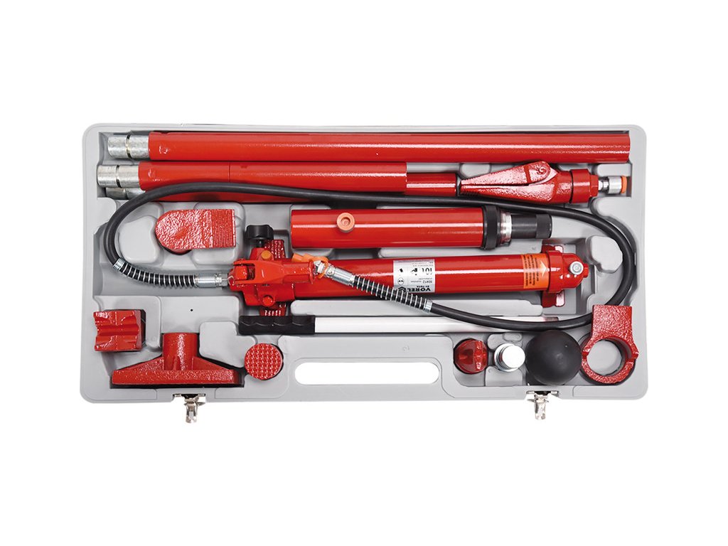 A hidraulikus széthúzó műhelymunkára szolgál, és használható összeszereléshez és karosszériamunkákhoz, melyek jelentős statikus erők alkalmazását igénylik. A készülék emelésre, nyújtásra, széthúzásra, hajlításra, egyenesítésre és kihúzásra szolgál. A készletet szállító bőröndben helyezték el. Súly [kg] - 35,4 Munkanyomás [bar] - 620 Csatlakozási menet mérete ["] - 13/16-20Unef Maximális terhelés [ezer kg] - 10 aktuátor dugattyú lökete [mm] - 150 szétszóró. Használható összeszereléshez és karosszériamunkákhoz, melyek jelentős statikus erők alkalmazását igénylik. A hidraulikus rendszer telepítése és használata: - csatlakoztassa a pumpa tömlőt a henger csatlakozójával, a csavaros kupakot a menetre tekerve. Győződjön meg arról, hogy a anya megfelelően meghúzódott. - zárja le a leeresztő szelepet., óramutató járásával megegyező irányban forgatva. - Mozgassa a pumpa kart fel-le, így nyomást létrehozva benne. Néhány mozgás után az aktuátor működni kezd. A nyomás megszüntetéséhez a pumpában, fordítsa a szelepet az óramutató járásának ellentétes irányába. A leeresztő szelep megnyitásával az aktuátor automatikusan visszatér a pihenő pozícióba. Ne szerelje szét a hidraulikus rendszert nyomás alatt. A pumpa bármelyik, függőleges vagy vízszintes helyzetben használható. A pumpa függőleges helyzetében a tömlő vége mindig lefelé irányuljon. Az olajszint ellenőrzése: Az olajszint ellenőrzéséhez a pumpában, állítsa azt függőleges helyzetbe, a tömlőt lefelé irányítva. Nyissa ki a leeresztő szelepet. Csavarja ki a szellőzőszelepet és vegye ki a rúd olajszintjelzőt, és olvassa le az olajszintet. Szükség esetén korrigálja az olajszintet úgy, hogy az olaj befedje az jelző teljes lapos felületét. A készülék gyárilag hidraulikus olajjal van feltöltve. Csak olajat használjon. Ajánlott a Hydrol hidraulikus olaj használata az L-HL-46 szimbólummal. Pumpa szellőztetése: A pumpa hidraulikus rendszerének szellőztetéséhez állítsa a pumpát függőleges helyzetbe, a tömlőt lefelé irányítva. Nyissa ki a leeresztő szelepet. Csavarja ki a szellőzőszelepet és vegye ki a rúd olajszintjelzőt. Végezzen néhány teljes pumpamozgást. Zárja le a leeresztő szelepet, szerelje be az olajszintjelzőt és zárja be a szellőzőszelepet. - hidraulikus pumpa - aktuátor - hosszabbító csövek 4 db