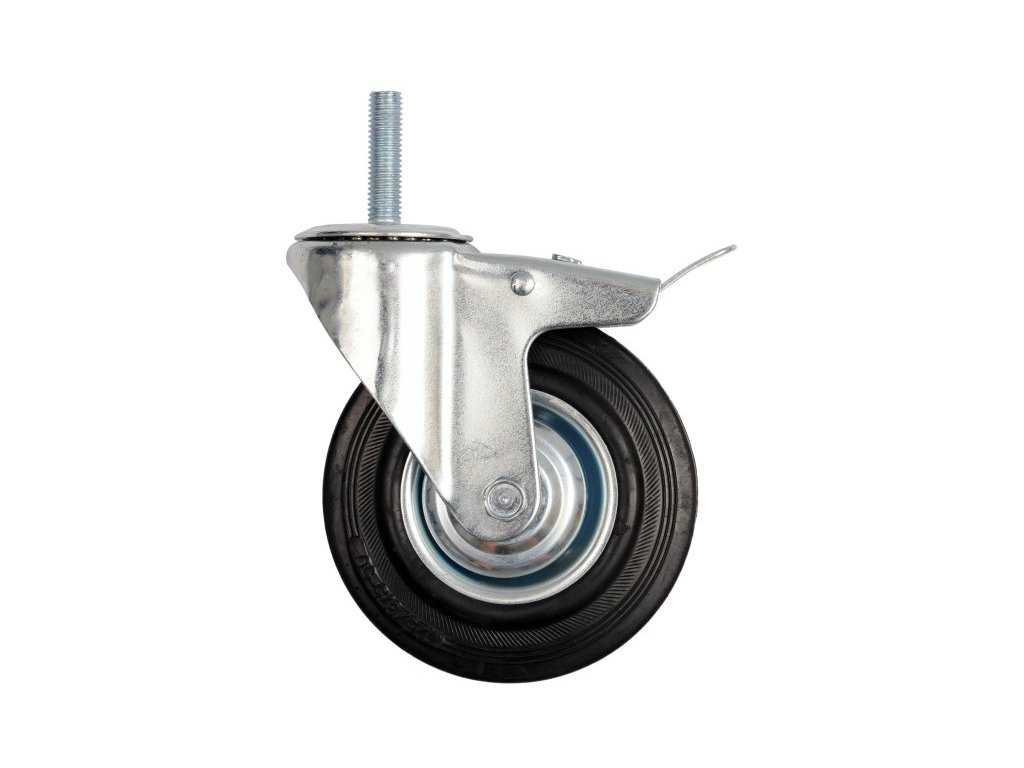 Otočné koleso s priemerom 200 mm a výškou 230 mm, s guľôčkovým ložiskom, brzdou, predstavec so závitom, behúň z čiernej gumy, maximálna nosnosť 150 kg.