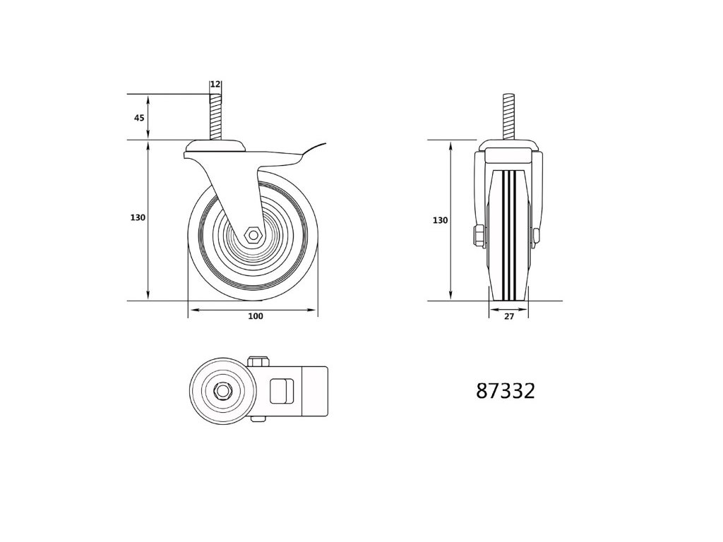 Kerék átmérője 100 mm, forgatható, menetes tűre szerelhető, csapágyazott, fékkel, fekete gumiabroncs, magasság 130 mm.