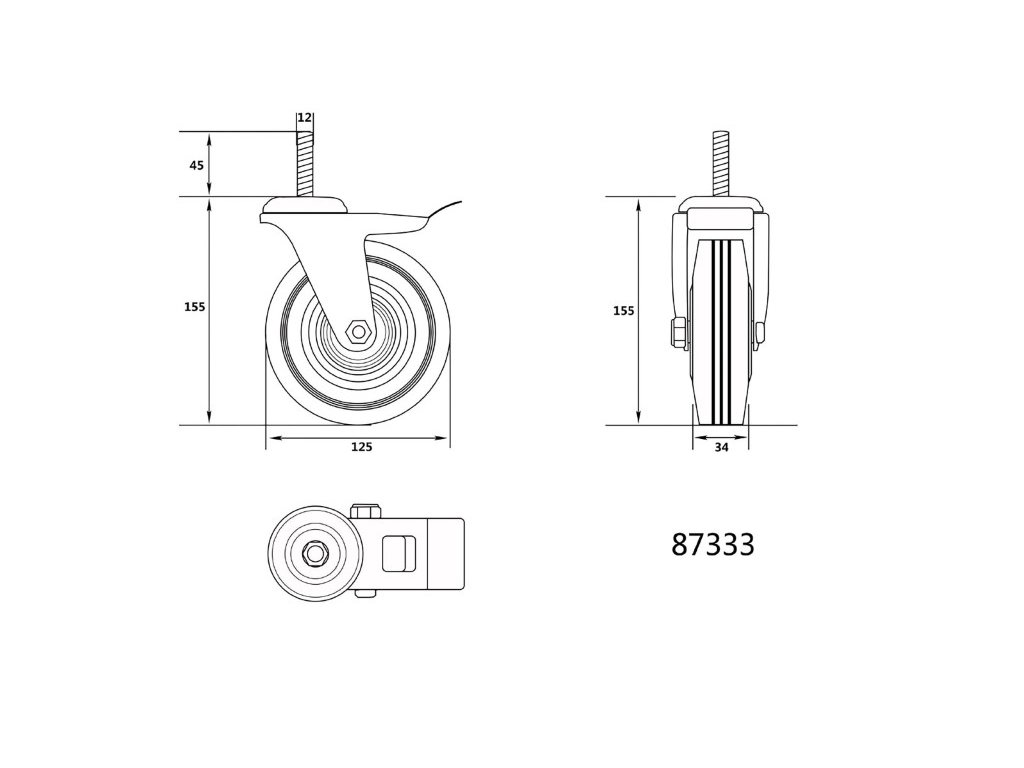 Kerék átmérője 125 mm, forgatható, menetes szárral szerelve, csapágyazott, fékkel, fekete gumi abroncs, magasság 153 mm.