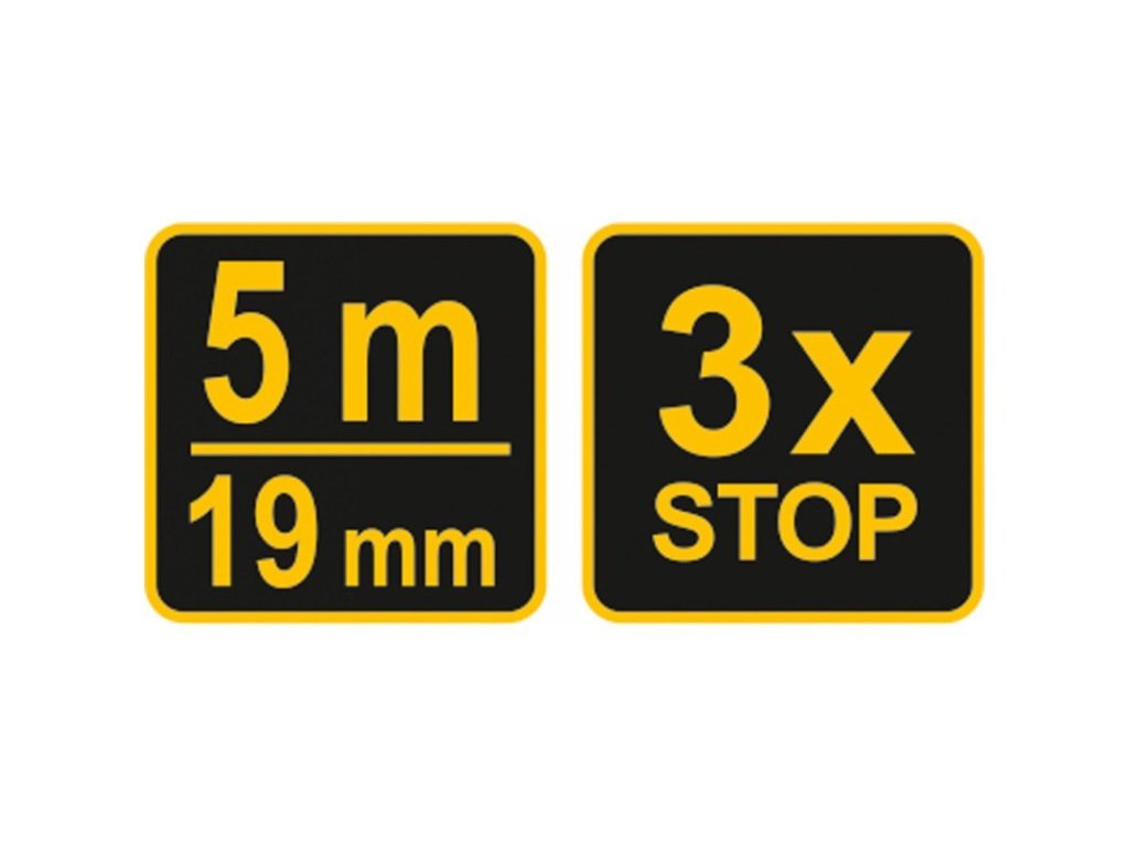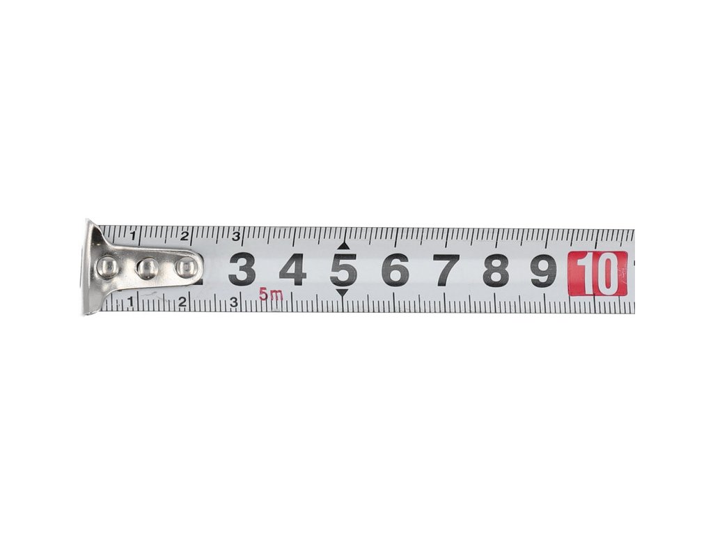 Mérj acél mérőszalaggal, ami 5 m hosszú és 19 mm széles, mozgatható horoggal a végén. A tok műanyagból készült, gumi borítással megerősítve.