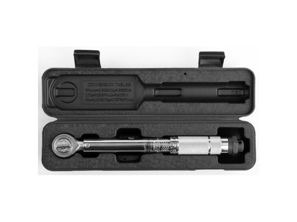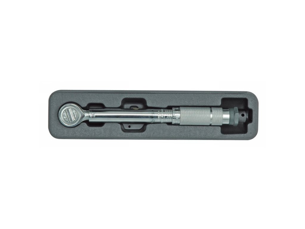 A dinamometrikus kulcs egy precíz mérőeszköz az erő pillanatnyi értékének mérésére. Menetes rögzítőelemek csavarására használják, hogy a csatlakozó pillanatnyi értéke ismert és megfelelő legyen az anyag típusához és a csavar és anyák szilárdságához. A kulcs egy négyzet alakú szárú fejből és erőt átvivő karról áll. A fejet hatszögletű kupakok rögzítésére használják. Összehasonlító táblázat a pillanatértékek különböző hossz- és erőegységekben: 1 kg*cm = 13.887 OZ*in (uncia X hüvelyk) 1 kg*cm = 0.867 LB*in (Font X hüvelyk) 1 kg*m = 9,80665 n*m (Newton x méter) 1 kg*m = 7,233 lb*ft (font x láb) 1 ft*lb = 12 lb*in (font x hüvelyk) 1 dm*n = 14.16 oz*in (uncia x hüvelyk) Főként autós technikában használják precíz rögzítéshez és ott ahol a gyártó meghatározta a csatlakozó meghúzásának időtartamát. - Válassza ki a megfelelő NM vagy In-LBS skálát. Lazítsa meg a blokkoló csavart a mikrométeres gomb végén. - Helyezze a mikrométeres gombot úgy, hogy a "0" a gomb skáláján fedje a kulcs vállán lévő függőleges vonalat. - Forgassa a mikrométeres gombot az óramutató járásával megegyező irányban, amíg be nem állítja a kívánt nyomatékot. A kívánt nyomaték akkor van beállítva, ha a mikrométeres gomb skálája fedésben van a kulcs vállán lévő függőleges vonallal. - Ezután húzza meg a zárócsavart a ellenállásig és állítsa be a rattles forgásirányát, utána a kulcs használatra kész. - Alkalmazza a megfelelő csatlakozást a kulcs terheléséhez. A meghúzás során, a beállított pillanat elérését a kulcs kattanása jelzi. Ha hallja vagy érzi a kattanást, hagyja abba a meghúzást. - dinamometrikus kulcs - felhasználói kézikönyv - garancialevél - bőrönd