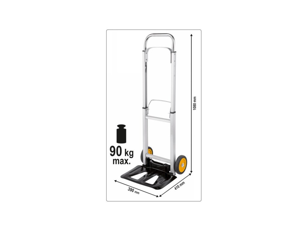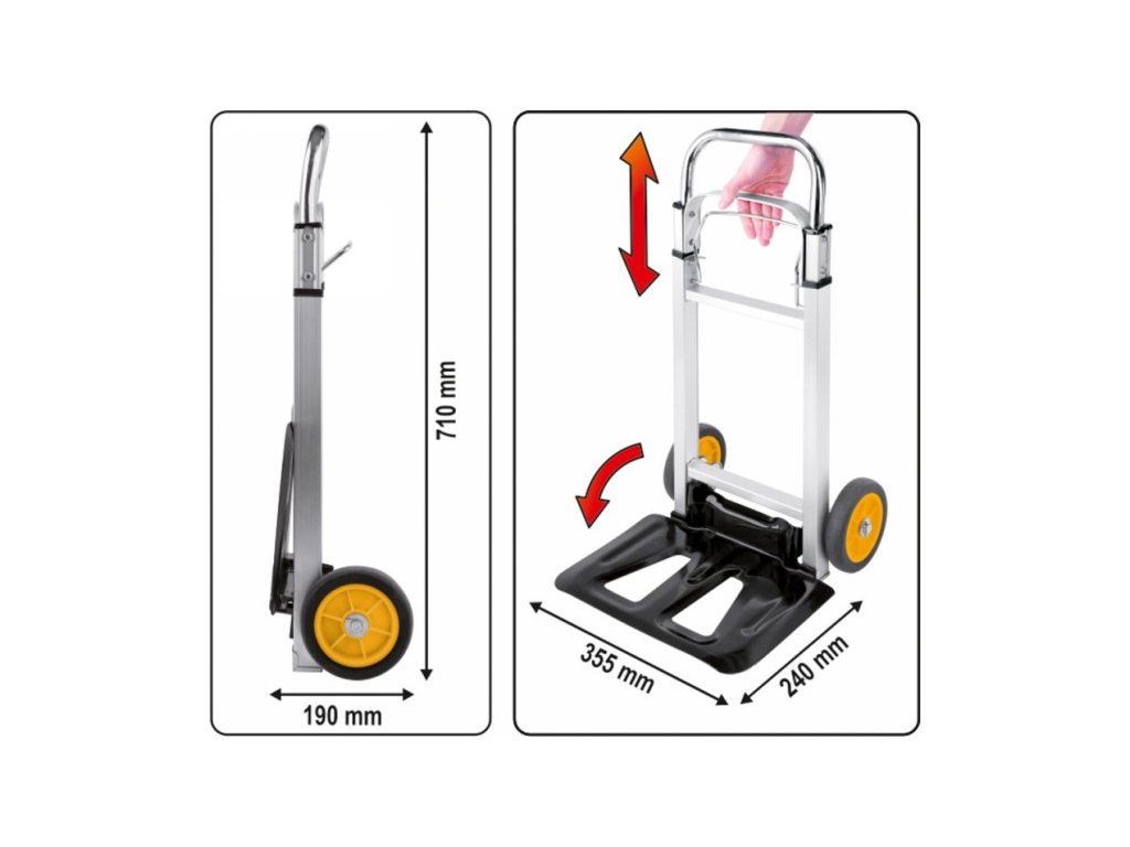 Veľká oceľová nakladacia plošina s rozmermi 355 x 240 mm vám umožňuje premiestňovať kartóny, škatule alebo kontajnery rôznych veľkostí Vďaka systému rýchleho skladania je možné nakladaciu dosku zložiť jedným pohybom Teleskopická násada s aretačným systémom dosahuje po vyklopení celkovú dĺžku 1080 mm, čo umožňuje ergonomický transport bez nadmernej námahy Navyše, stabilné priečne protizávažie, ktoré je k nemu pripevnené, značne uľahčuje zdvíhanie nákladu Významnou výhodou mlynského vozňa je jeho kompaktná konštrukcia Po zložení má rozmery 190x710x390 mm Vďaka tomu sa veľmi ľahko skladuje alebo prepravuje a ľahko sa zmestí do kufra každého auta Kolieska PP + EVA s priemerom 150 mm sú odolné voči opotrebovaniu Ľahká hliníková konštrukcia s hmotnosťou len 4,3 kg zaisťuje dlhodobé používanie Technické údaje.Materiál: hliník.