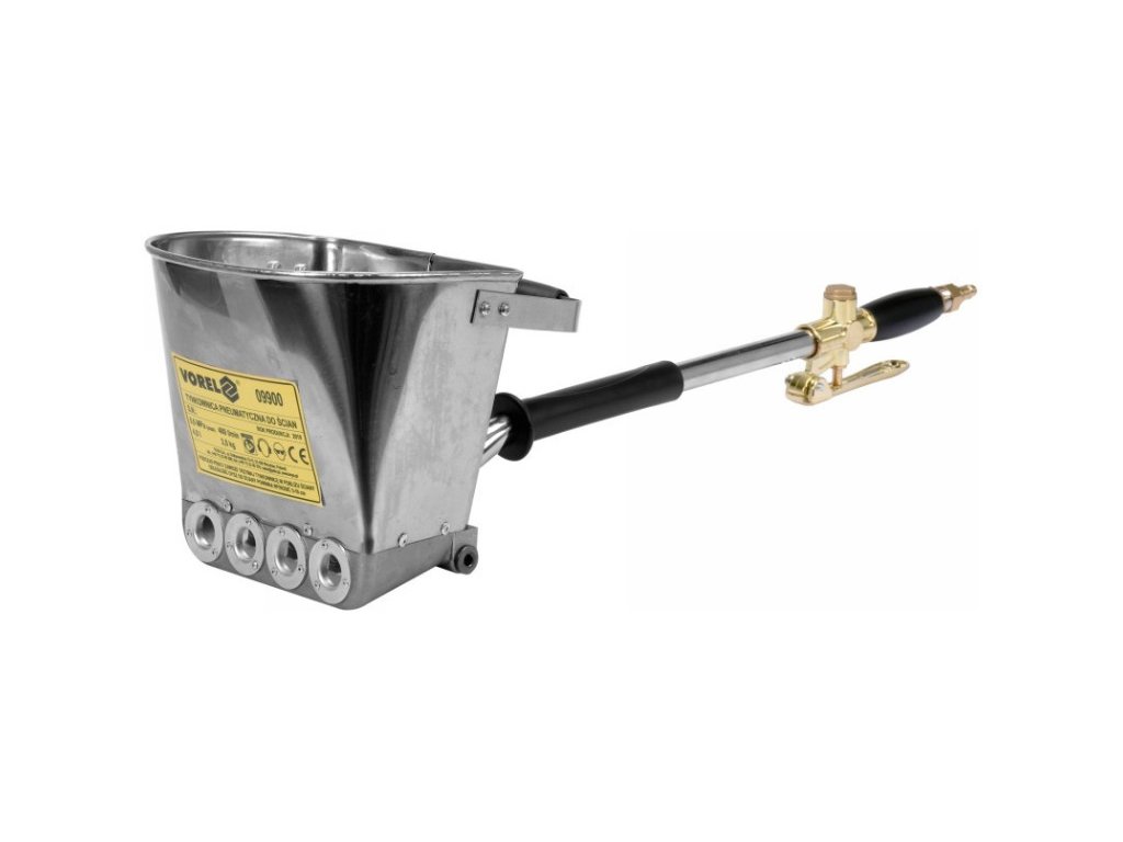 Pneumatikus vakoló, rozsdamentes acélból és minőségi műanyag lemezből készült, réz szeleppel és levegő csatlakozókkal. Tervezve a gyors és hatékony vakolásra a legtöbb tipikus vakolat és falazóhabarcs segítségével. A vakolás jelentősen felgyorsítja a vakolást, miközben növeli annak minőségét. A vakoló használata szükséges a munka elvégzéshez. A tartály kapacitása kb. 4,5l, a kipufogó fúvókák száma-4, átlagos teljesítmény-kb 50 m²/1h, réteg kb. 10 mm, egy személy munkája esetén, a készülék súlya 2,1 kg, szükséges légnyomás 4-5 bar, szükséges kompresszor teljesítmény kb. OK 350 l/perc a gyors és hatékony vakolópermetezéshez a legtöbb tipikus vakolat esetében. Kompresszor csatlakozása szükséges. Csatlakoztassa a készüléket egy pneumatikus kábellel a kompresszorhoz, alkalmazza a megfelelő mennyiségű malter/vakolatot a tartályba, irányítsa a lyukakat a vakolandó fal felé, nyissa ki a beömlő szelepet, permetezzen egyenletesen a szükségleteknek megfelelően. Munka befejezése után mártsa a vakolótartályt vízbe és öblítse ki. Vakolat nélkül kígyó és kompresszor