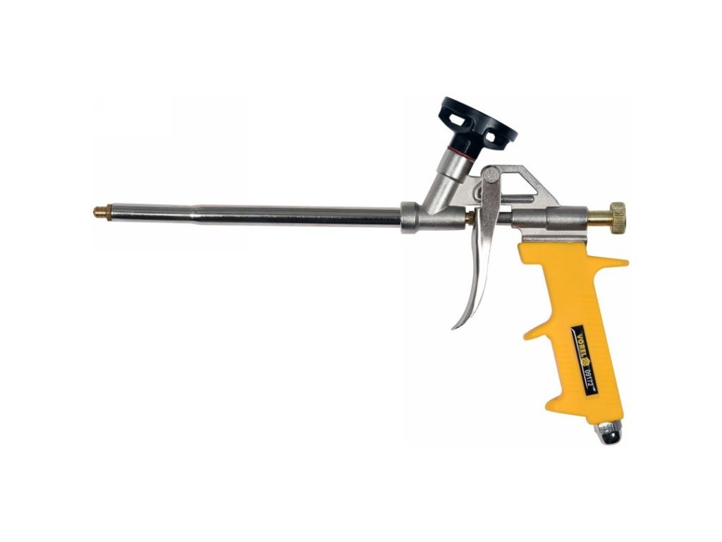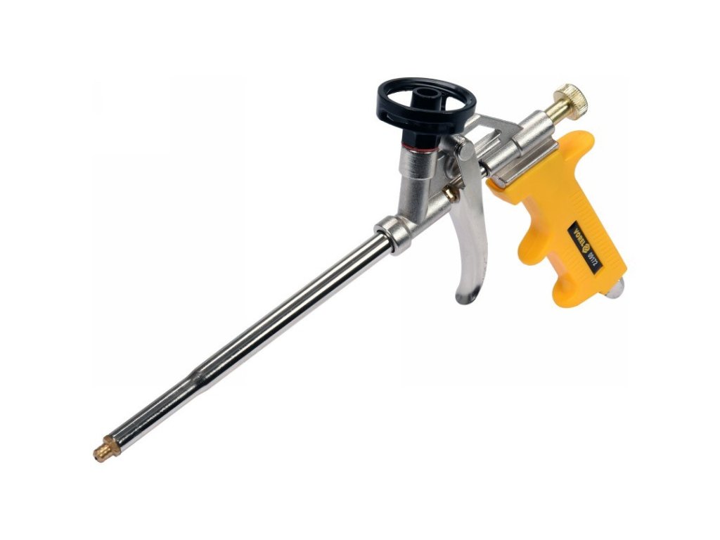 Rozsdamentes acélból és sárgarézből, valamint ellenálló műanyagokból készült pisztoly. Szabványos csavaros tartályokból származó habok alkalmazására tervezték.