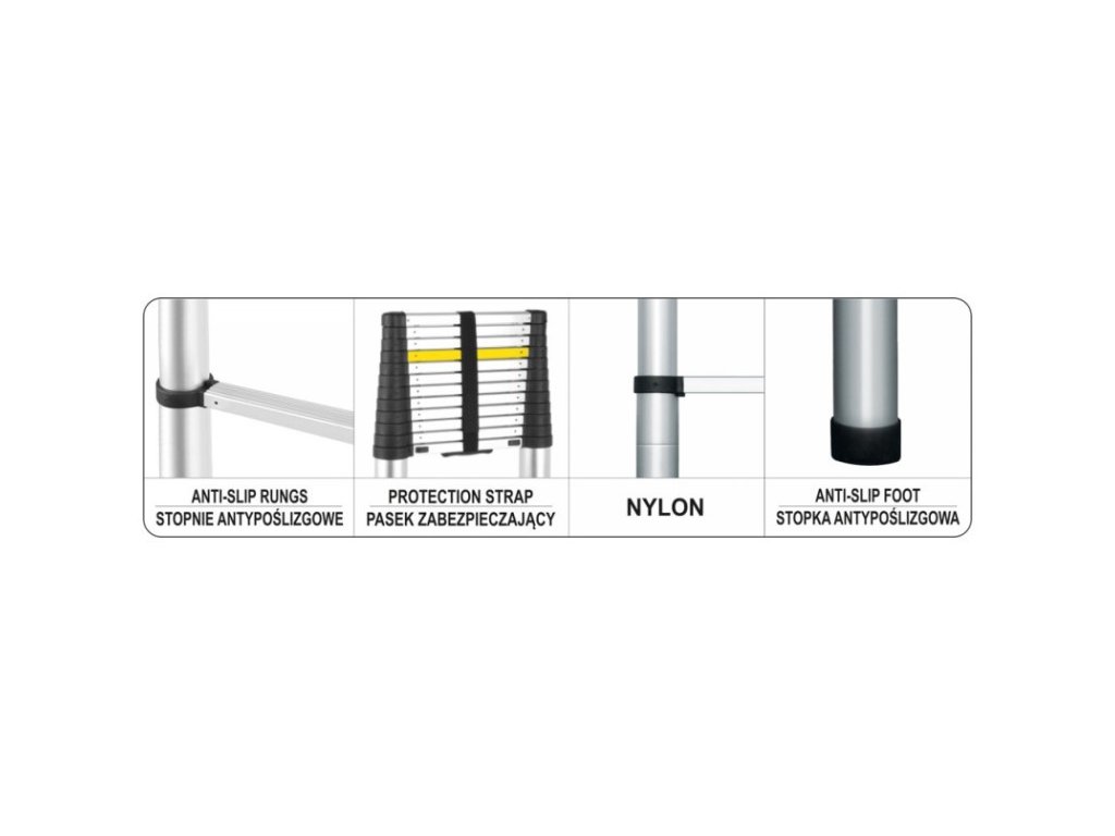 Magas minőségű anyagokból készült. A teleszkópos profilok és lépcsőfokok alumíniumból készültek. A lépcsőfokok és a teleszkópok összeköttetései nylonból készültek - egy anyagból, amely ellenáll az alacsony hőmérsékleteknek (nem reped meg a hidegben) és az időjárásnak (nem morzsolódik szét néhány év után). Magas minőségét a EN131-6:2015 szabványoknak való megfelelőséget igazoló tanúsítványok igazolják.