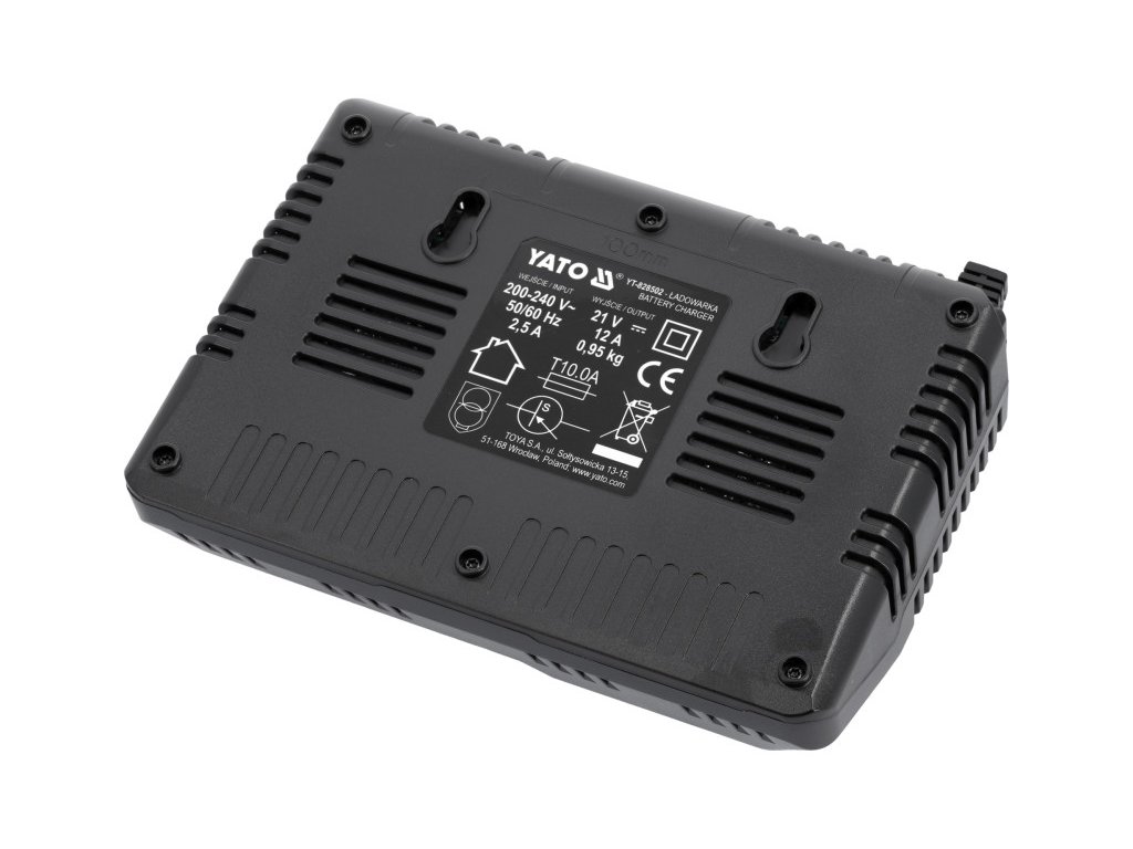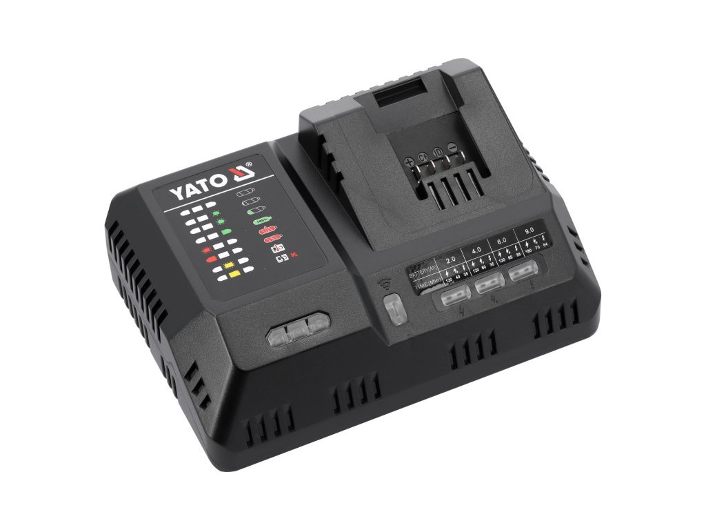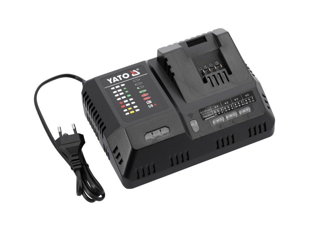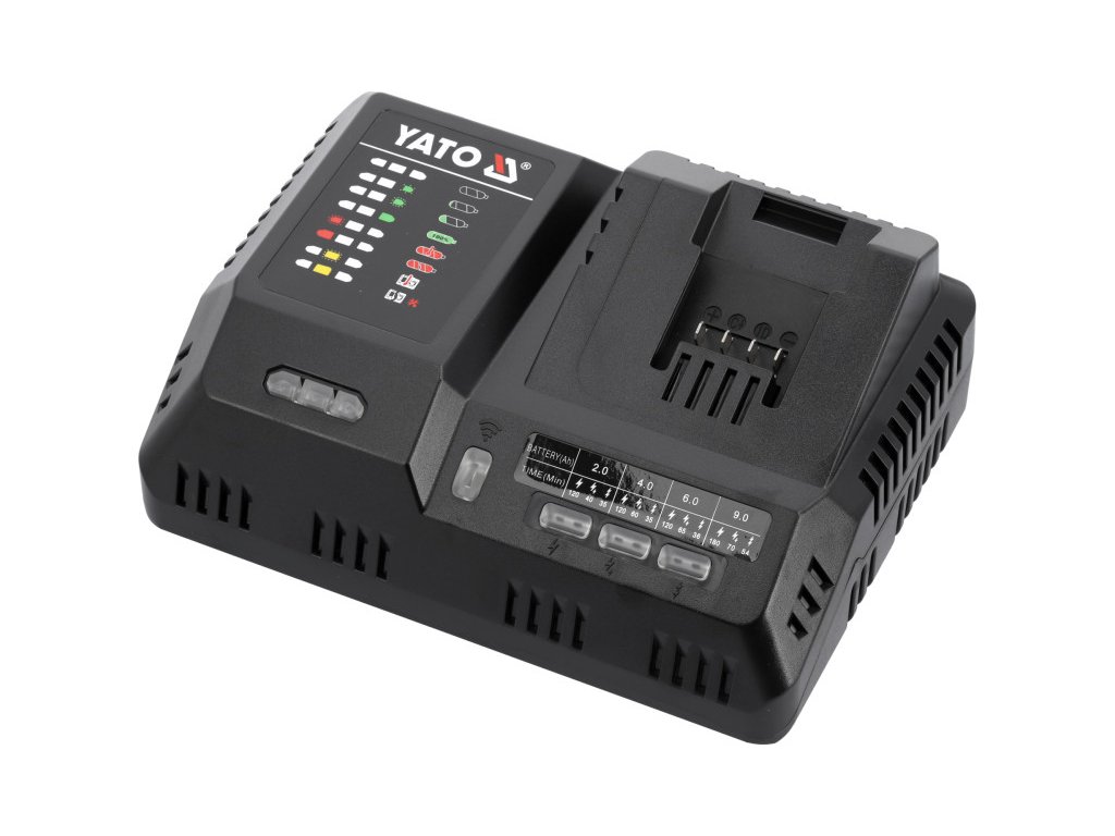 A piacon elérhető leggyorsabb lítium-ion akkumulátor töltő a YATO 18 voltos rendszerhez. A készülék érzékeli a csatlakoztatott akkumulátor típusát és a maximális biztonságos árammal tölti, amit az akkumulátor képes befogadni, 2A-tól 12A-ig adagolva az áramot. A töltő hűtőventilátorral van felszerelve a cellák töltés közbeni hűtésére.