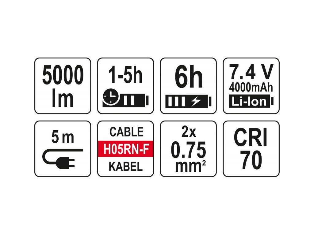 Összecsukható Yato hálózati és újratölthető fejlámpa maximum 5000lm teljesítménnyel. Három mód és két szín világítás lehetővé teszi az illumináció beállítását a tevékenységekhez és az akkumulátor szintjéhez igazítva. Egy erős 7,2V 4000mAh lítium-ion akkumulátorral felszerelve, 1-től 5 óráig működteti a lámpát, és folyamatos működés lehetséges DC hálózati hozzáférés esetén. További előny a szabályozható világítási szög és a állvány magasság.
