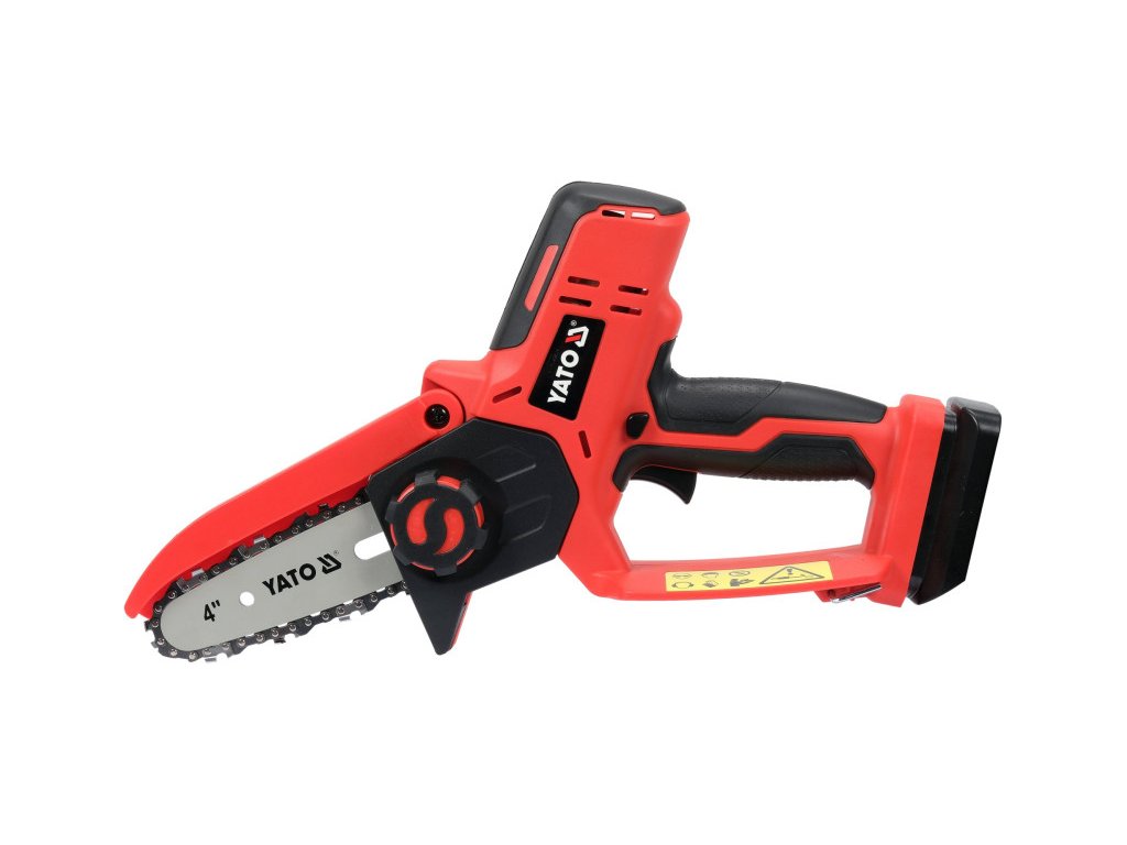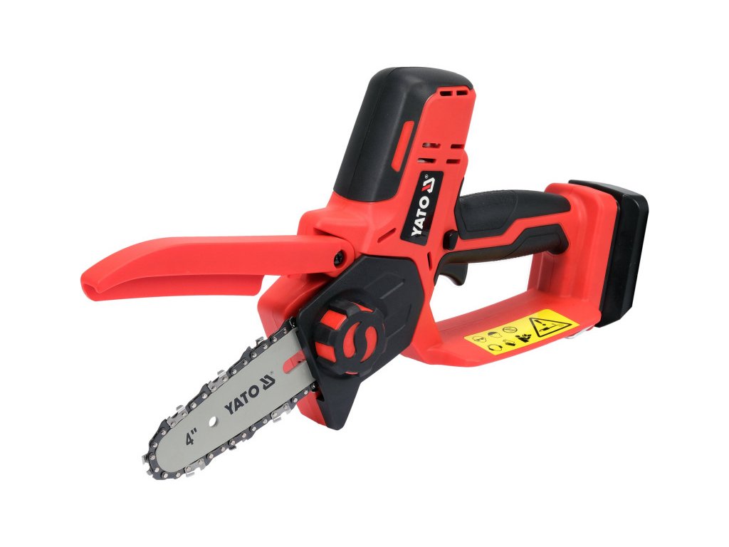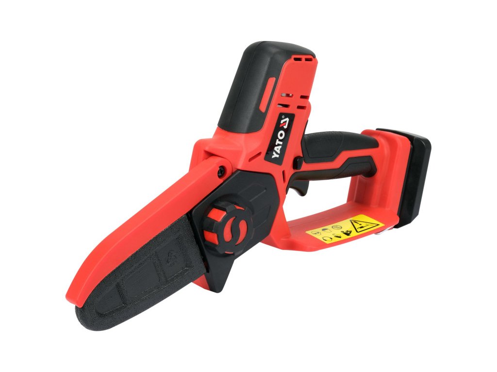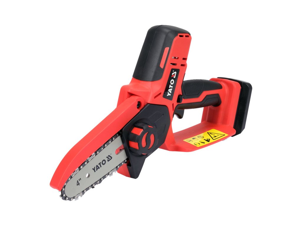 Kis, kézreálló 18-voltos akkumulátoros láncfűrész kerti és tetőfedő munkákhoz. Tökéletes gyors faágak, cserjék, fiatal fák metszéséhez, kerti építmények átvágásához.