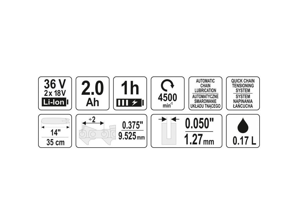 36 voltos akkumulátoros láncfűrész. Háztartási és kerti munkákra tervezve: könnyű, kompakt és könnyen használható. Lehetővé teszi a kerti és felújítási, építési munkálatok könnyű elvégzését.