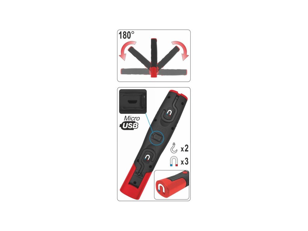 A forgatható ház lehetővé teszi a lámpa bármilyen szögben történő döntését. Ennek és a két horognak és a három mágnesnek köszönhetően könnyen és rugalmasan rögzíthető. Ez lehetővé teszi a kívánt tér optimális megvilágítását, miközben a kezei szabadok maradnak.