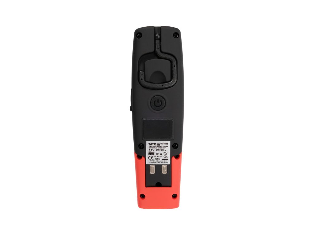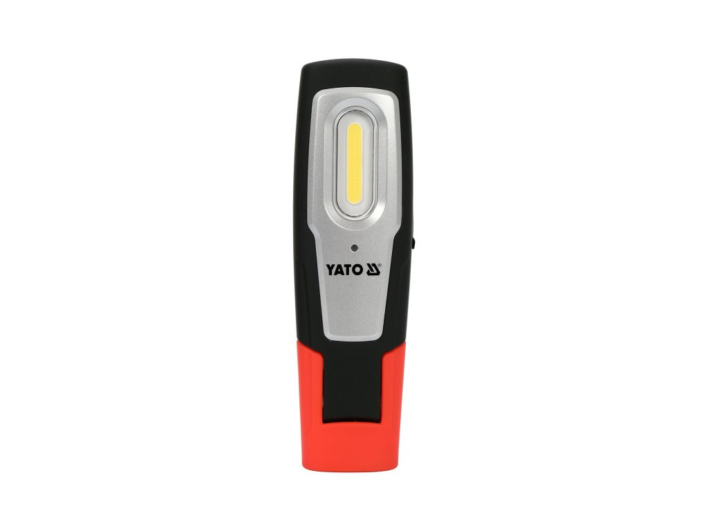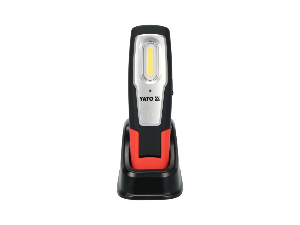 Yato újratölthető műhelylámpa 600lm fényszóróval és 120lm zseblámpával. A modell egy 2600mAh lítium-ion akkumulátorral van felszerelve, amely minimum 1,5-től 10 óráig tartó folyamatos működést biztosít. Az ABS és a policarbonát tartós anyagokból készült, így az IK07 mechanikai védelmi osztályú és az IP54 vízállósági besorolású. A forgatható test, a horog és a 2 mágnes lehetővé teszi a fényáram megfelelő beállítását. További előny a lámpa vezeték nélküli töltésére szolgáló mágneses állomás.