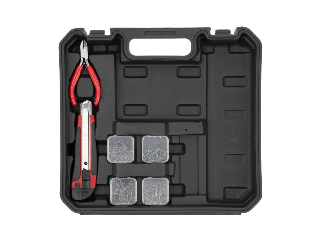 Mellékelt tartozékok: négy különböző formájú kapocs, mindegyikből 50 darab, oldalfogó, vágó, akkumulátor töltő, hordozótáska.
