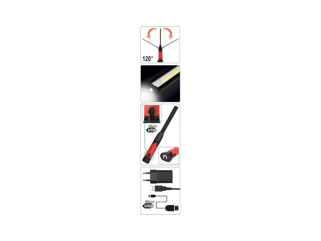 Funkčné 5W pracovné svetlo s 3W baterkou navrchu Svetelný výkon 600 lumenov a 3 režimy svietenia zaručujú efektívnu a pohodlnú prácu Magnet v spodnej časti umožňuje pripevnenie lampy na kov Dlhá, tenká a o 120 stupňov nastaviteľná horná časť svietidla pomáha osvetľovať ťažko dostupné miesta.