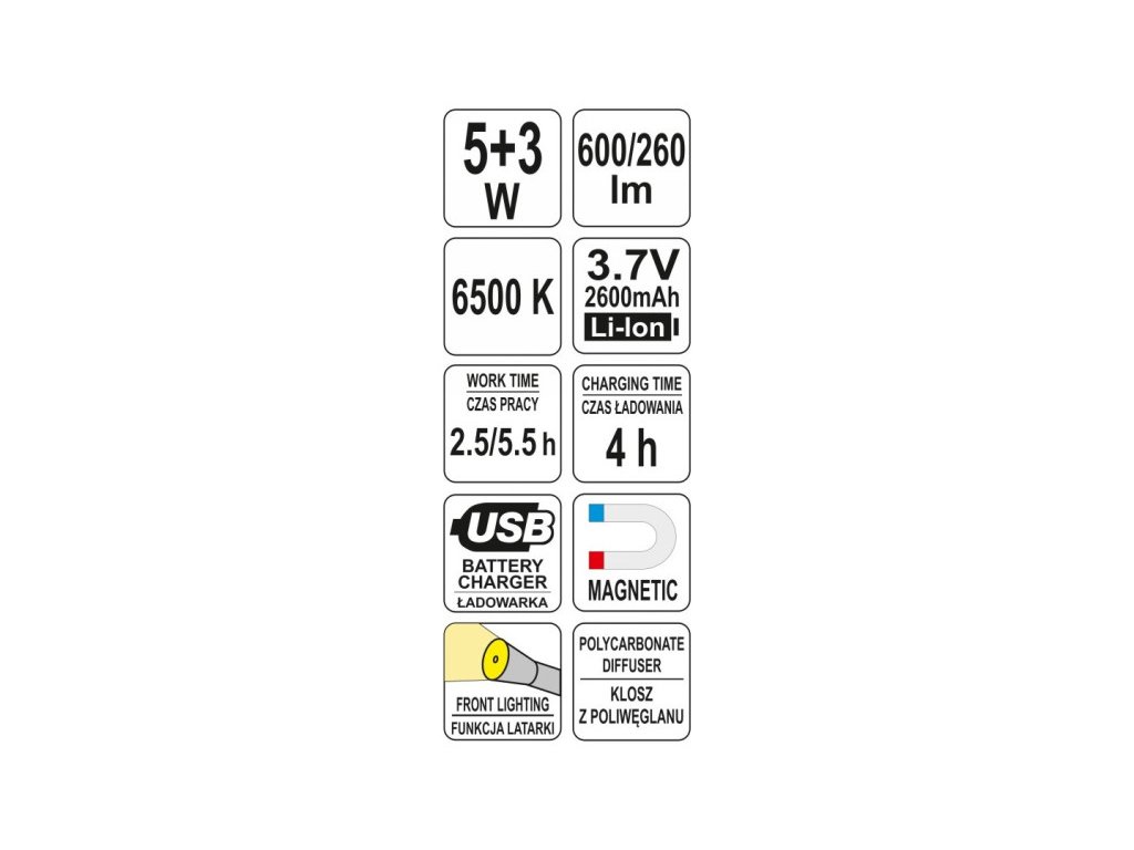 Funkcionális 5W műhelylámpa egy 3W zseblámpával a tetején. A 600 lumen fényerő és a 3 fényüzemmód garantálja a hatékony és kényelmes munkát. Az alsó részen található mágnes lehetővé teszi a lámpa fém alkatrészekhez való rögzítését. A lámpa hosszú, vékony és állítható feje lehetővé teszi a nehezen megvilágítható helyek megvilágítását.