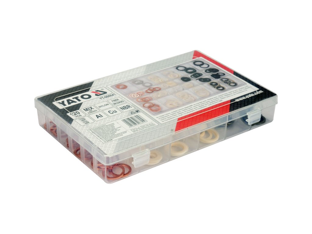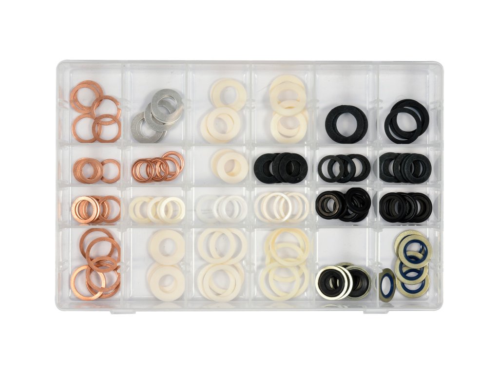 120-as olajleeresztő csavar alátét készlet. Az egész készlet egy kényelmes rendező csomagolásban található. A készlet alumíniumból, fémből és gumiból, nylonból, szálasanyagból és rézből készült alátéteket tartalmaz.