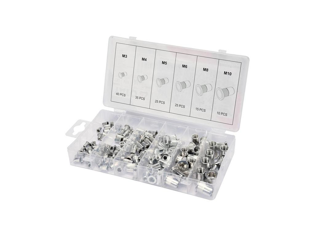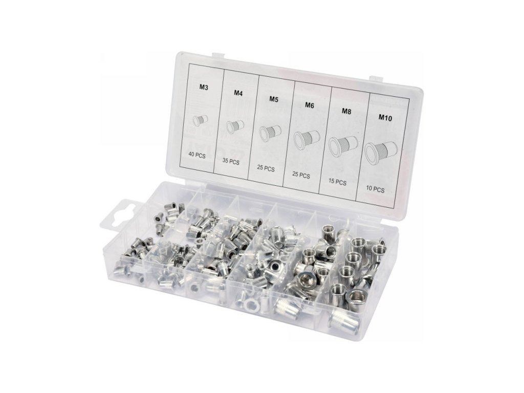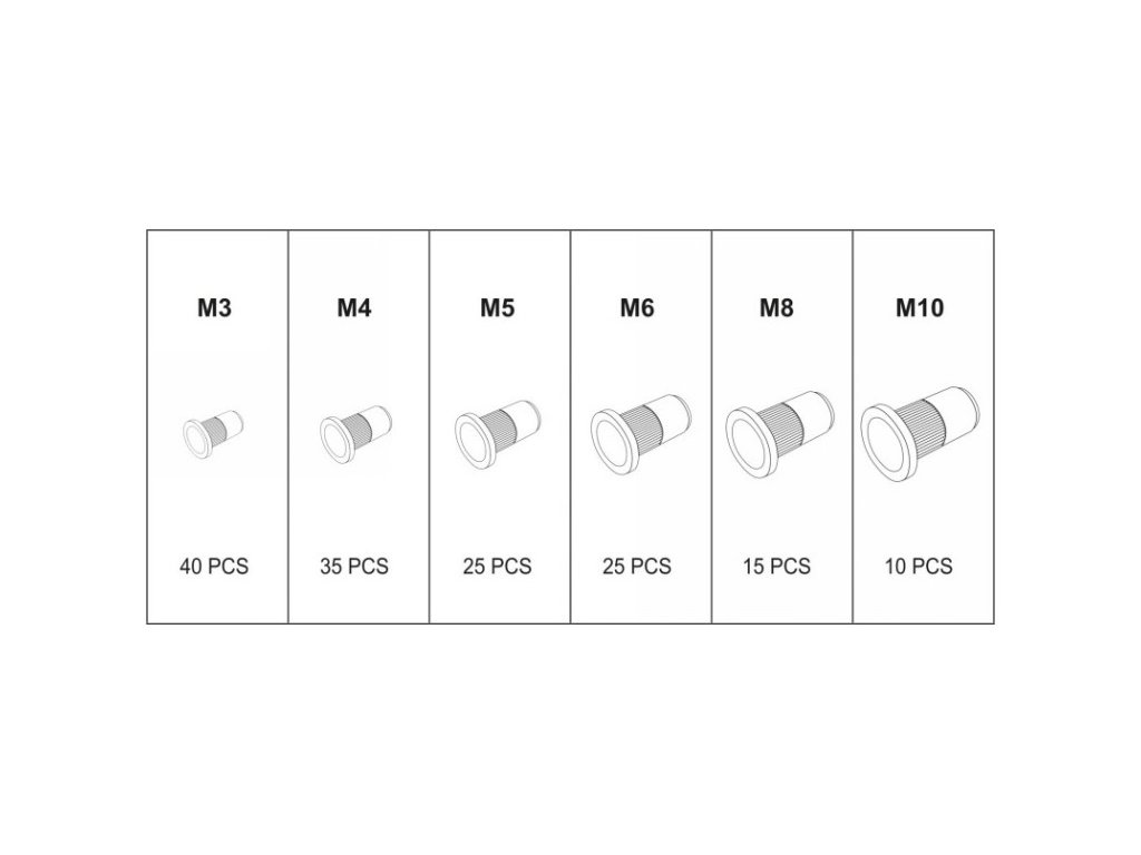 Összetétel: M3- 40 darab, M4-35 darab, M5- 25 darab, M6- 25 darab, M8-15 darab, M10-10 darab.
