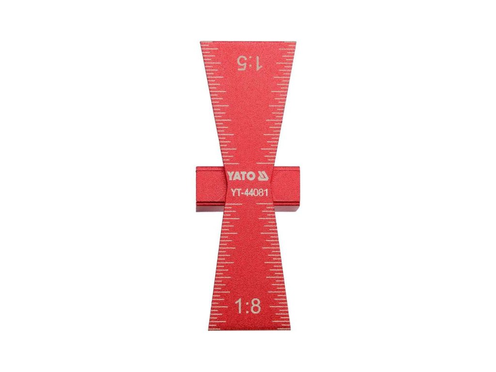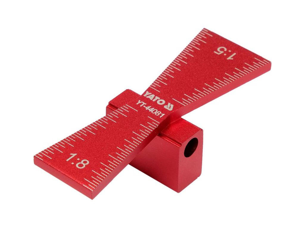 Šablóna na výrobu rybinových spojov vo veľkostiach 1:5 a 1:8 Vyrobená z kovu, s priehľadnými značkovacími stupnicami na spájanie drevených prvkov, tzv rybinový chvost Technické údaje: Rozmer 64x23x18mm Materiál hliník Povrch lakovaný